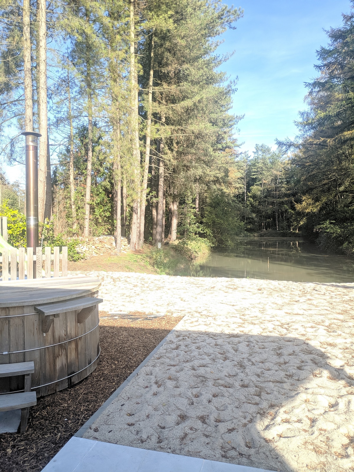 met zwemvijver, hottub, bosrijk en rustig gelegen.