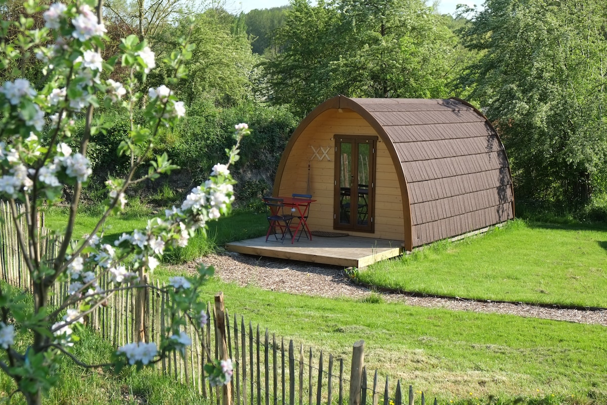 Drie ecologische camping 'Pods' in de Vlaamse Ardennen, elk met een aparte privé-badkamer , uitgerust met dubbel bed (+ extra bed), elektriciteit, verwarming, picknick-ruimte en gemeenschappelijk keukentje. Opties: Je kan bij ons een ontbijtmand bestellen aan €15,- pp. De bedden zijn gedekt en de badkamer is voorzien van toiletpapier, shampoo, douche- en handzeep. Handdoeken zijn beschikbaar aan €5 per pakket (voor 2pp). Prijs op basis van 2pp, extra persoon €13