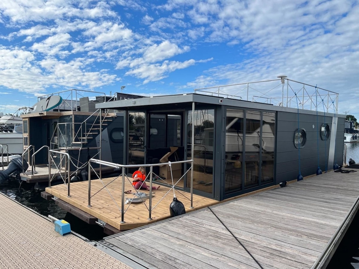 Modern designed Homeboat -unique houseboat- concept of comfortable living on the water - located in the countryside on a channel - apartment 46 sqm and 30 sqm terraces- Marina Westhoek all port facilities- 1 km to Nieuwpoort Stadt centre and 40 km to Brugge