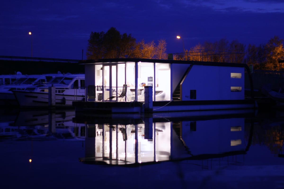 Modern designed Homeboat -unique houseboat- concept of comfortable living on the water - located in the countryside on a channel - apartment 46 sqm and 30 sqm terraces- Marina Westhoek all port facilities- 1 km to Nieuwpoort Stadt centre and 40 km to Brugge