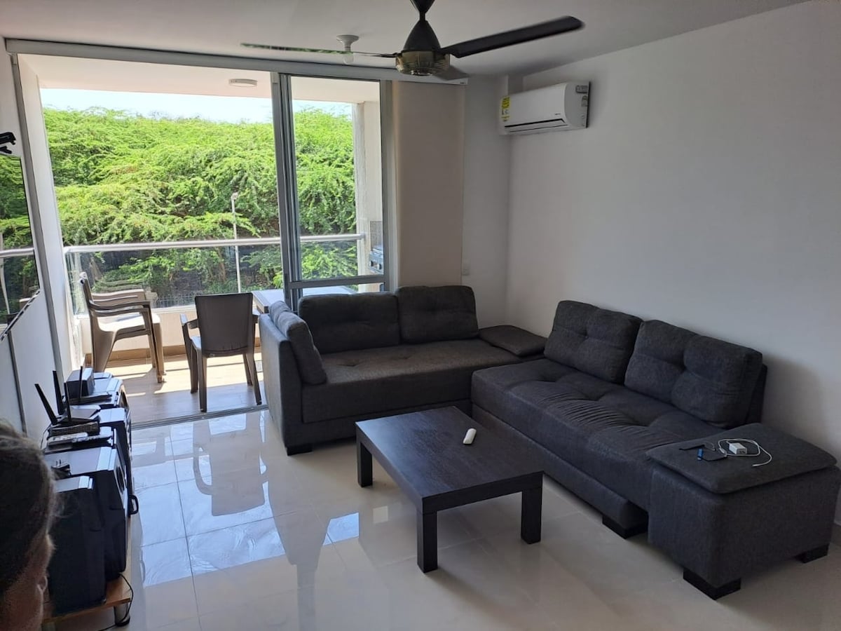 Magnifico apartamento con espectacular vista, completamente dotado. Dos habitaciones cada una con aire acondicionado. Wifi, Smart TV en sala y habitaciónes con las aplicaciones de Streaming (Ingresar con sus propias cuentas debido a las políticas de las plataformas), BBQ gas natural en balcón, hamaca. Conjunto con jacuzzi, piscinas, tenis de mesa, billar pool, futbolín, gimnasio. Complejo deportivo con canchas de tenis, futbol 5, cancha múltiple, parque infantil e iglesias