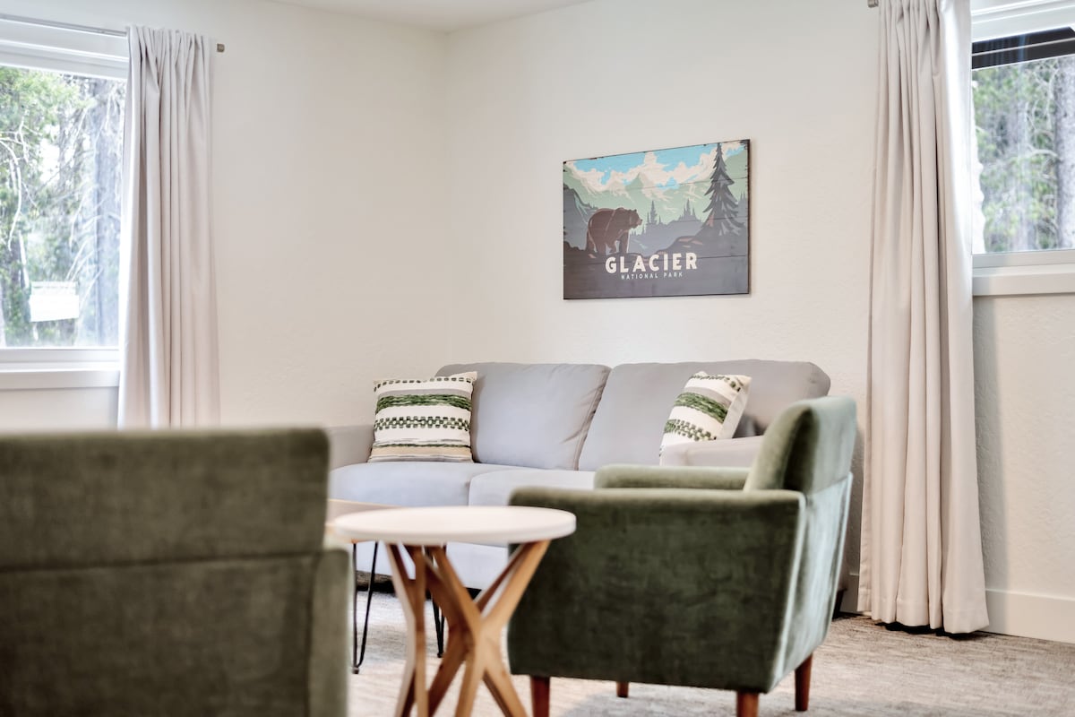 Lovely bed and breakfast home on the north end of Kalispell near Glacier Park. Snacks provided for breakfast, not a full meal. Every bedroom has a private en suite bathroom. On the 1st floor, Mid Century Suite includes a king bed, desk, large TV, closet & coffee bar. One parking space per suite. The cute house with shared common areas include a kitchen, a dining area with several tables, a comfortable living room & two washers & dryers. Also a large covered deck for outdoor seating and a yard!