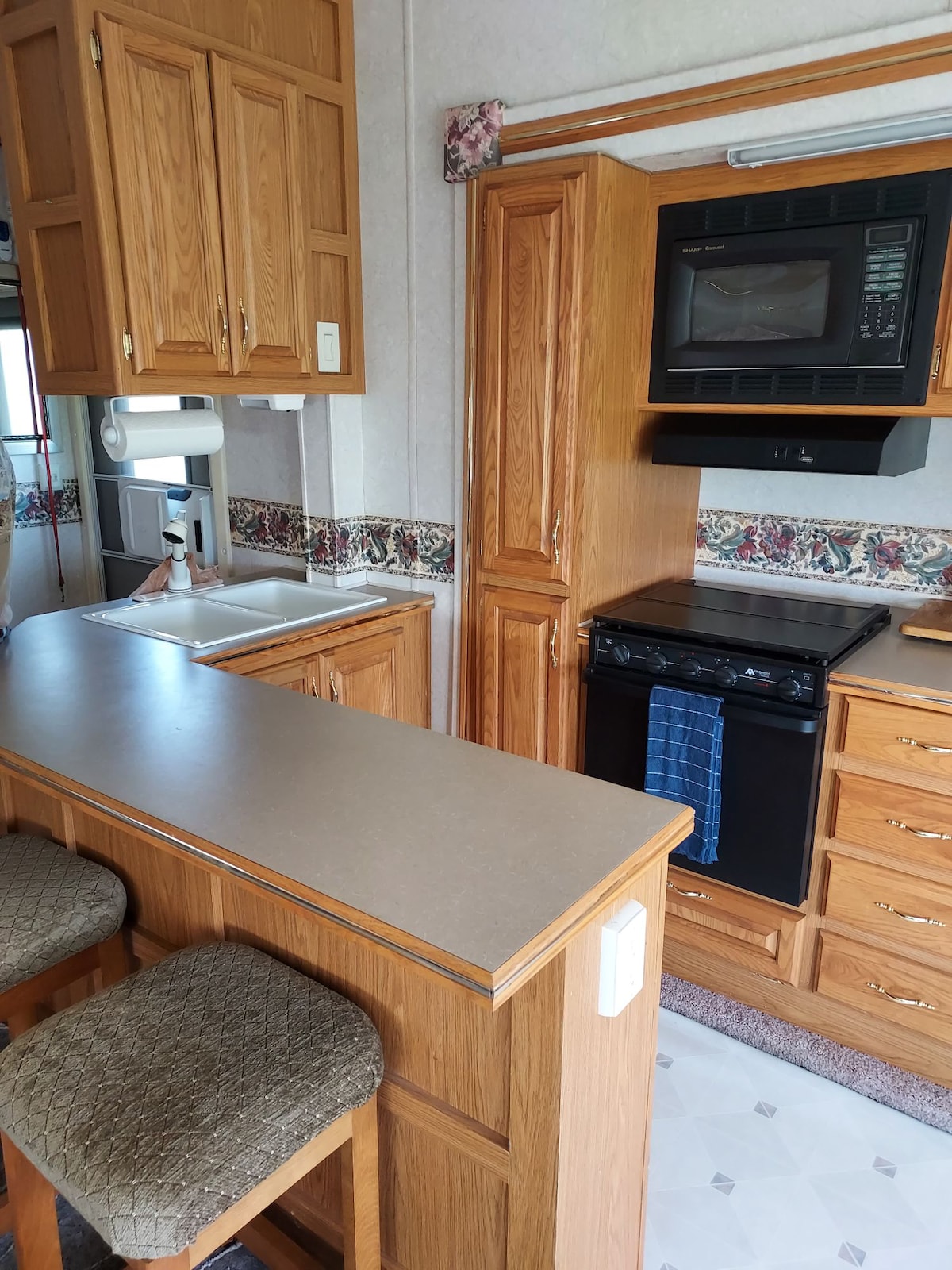 Enjoy the lovely setting of this rustic spot in nature just a short drive to Whitefish and Glacier NP. Camper is permanently parked with a queen bed with a door that closes, full bed in front, and couch that pulls out to a full bed. 2 large slideouts. Fully stocked kitchen and bathroom. TV and stereo. Living rom area is large with a nice table and couch Outside we have a deck with patio furniture, a grill, and a nice sunshade with lights.