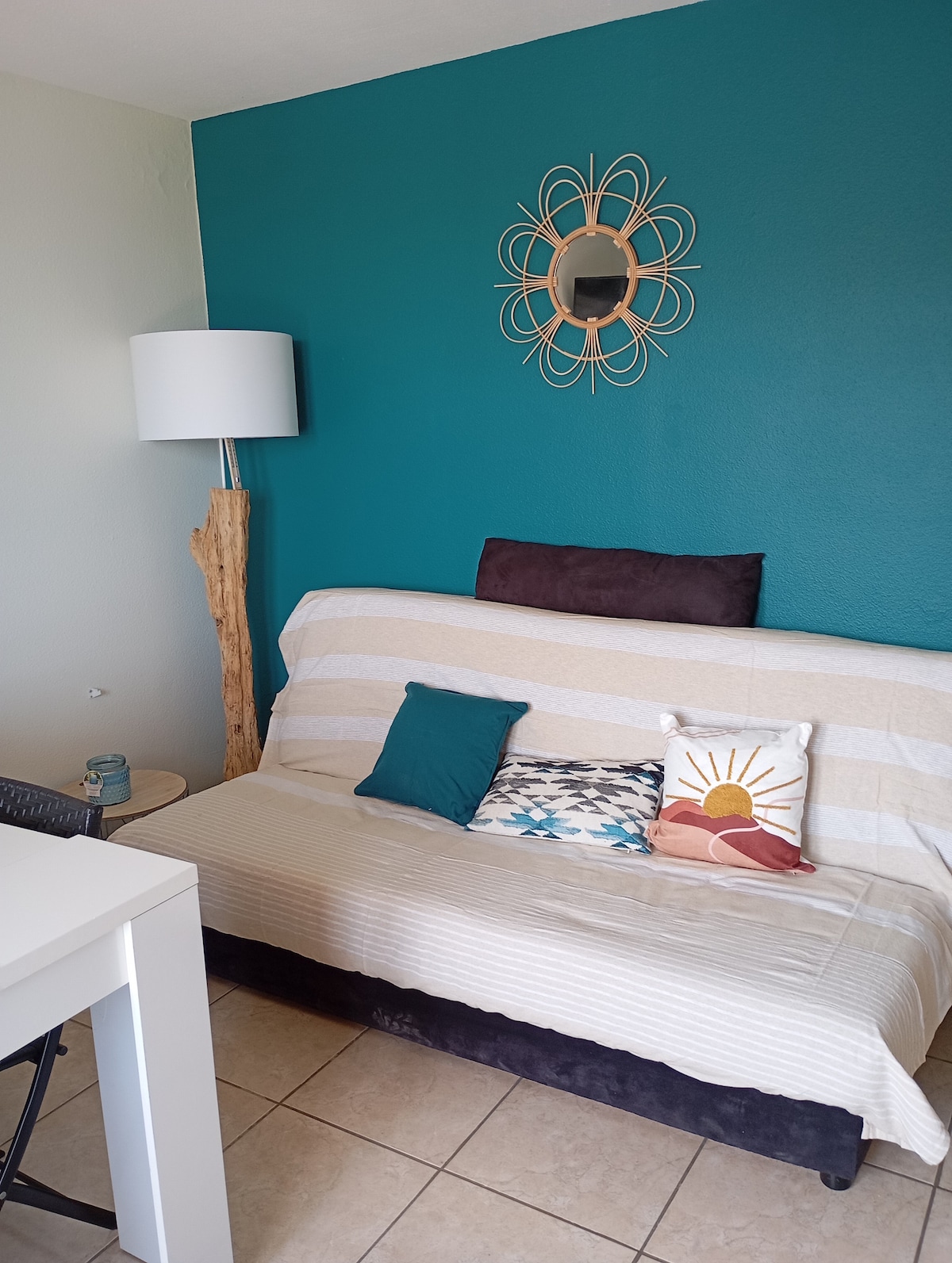 À découvrir à St Pierre-La-Mer, charmant appartement de type 2 bis - 32 m² (4 voyageurs = 1 couple + 2 enfants), terrasse de 10 m² avec vue mer, une cuisine ouverte sur un beau séjour, une chambre avec un lit 140X190, 1 salle d'eau avec douche à l'italienne et un wc. À l'étage, 1 mezzanine avec un convertible 140X190. Pour + de confort, ce bien est équipé de la fibre et d'une place de parking sécurisée dédiée aux voyageurs. Les frais de ménage couvrent la mise à disposition du linge de maison.