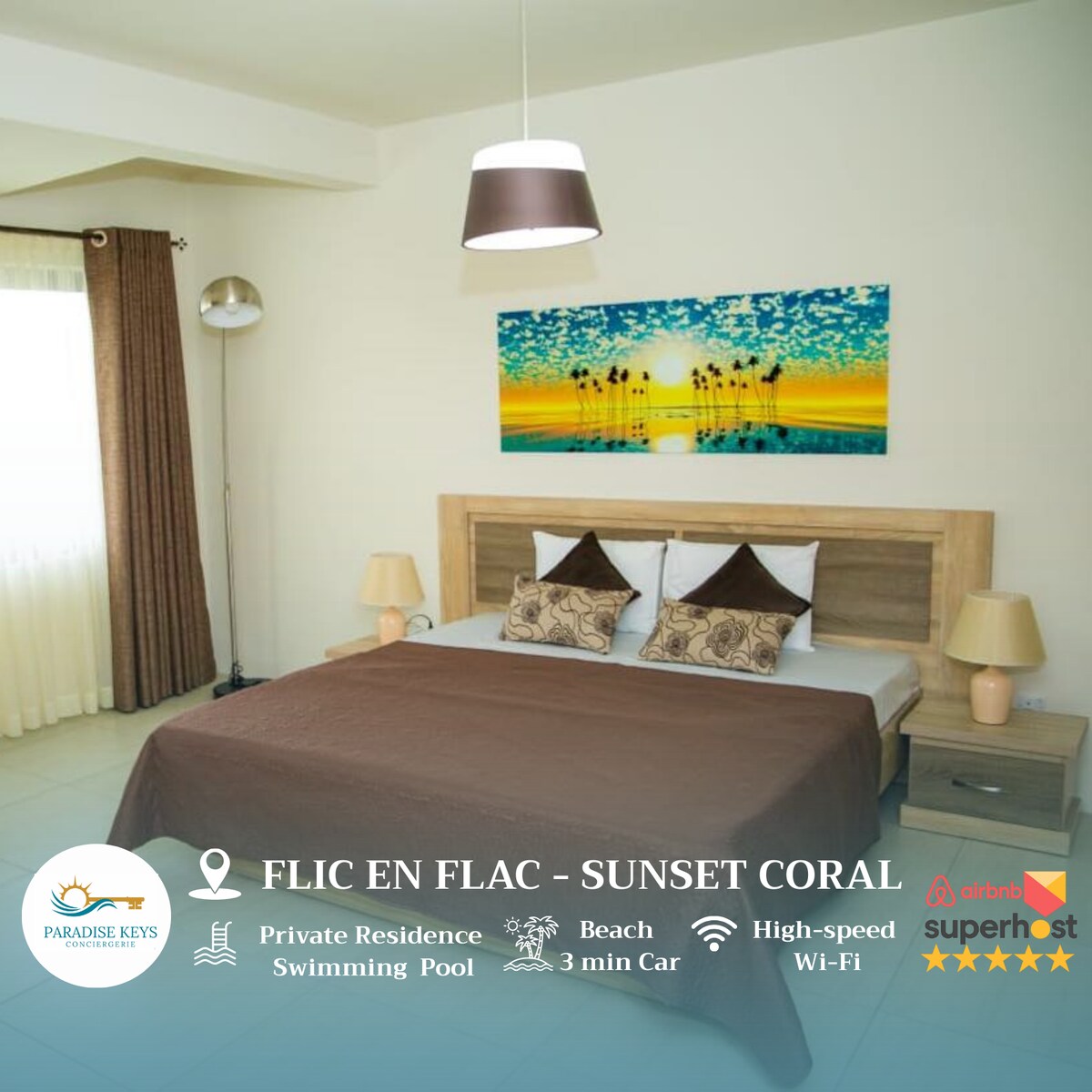 A spacious, stylish and modernly decorated 2 bedroom Condo in a secure complex. Ideally located for sun lovers with direct access to one of the best and longest beaches. Perfect for watching the beautiful sunsets either from the Condo balcony or the beach. Convenient base to explore the natural beauty of the island and get to know the Mauritian life. Convenient location, close to all amenities including shops, public transport, restaurants, bars and hotels are within walking distance.