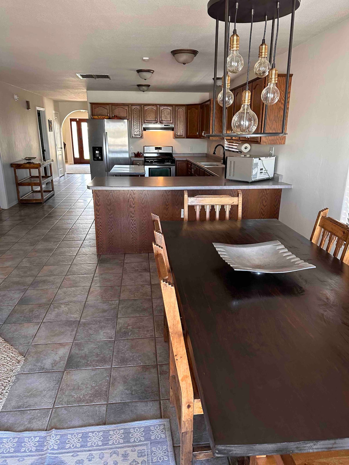Beautiful Southwest Casita lovingly decorated with vibrant furnishings and pieces created by local artisans. Located near historic downtown Farmington, and a short drive to the regional airport, golf courses, and river fishing. Surrounded by historical and natural attractions such as Shiprock, Four Corners Monument, Mesa Verde. Spacious home with three bedrooms, two baths, large yard and enclosed covered back patio. Lots of space for entertaining, with a BBQ grill and indoor/outdoor seating.