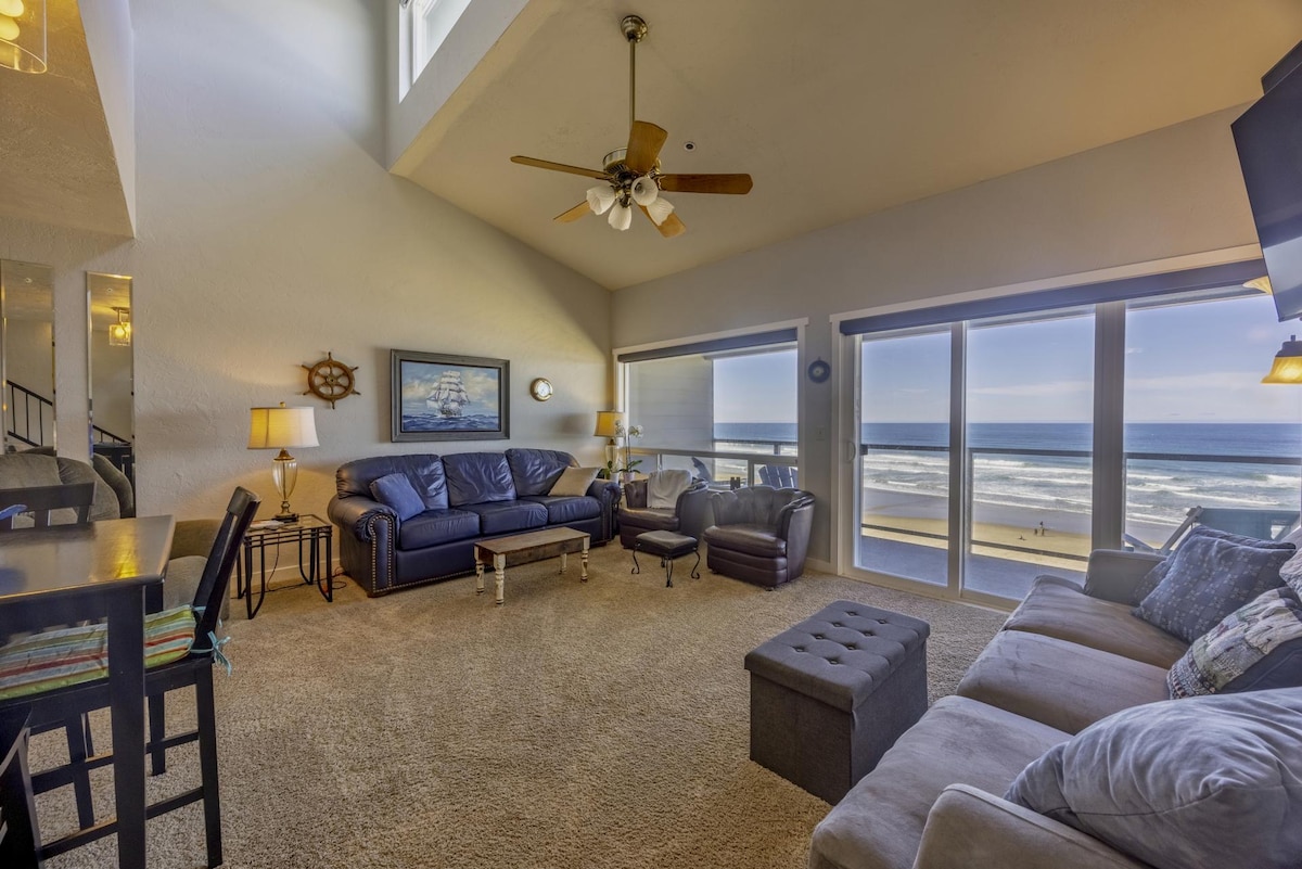 Perched on the top floor at the corner of the building, this oceanfront condo features breathtaking panoramic views of Nye Beach, Yaquina Head Lighthouse, and the shimmering Pacific Ocean — creating the perfect backdrop for a romantic seaside retreat. • 2 King Bedrooms • Ocean-view jacuzzi tub – unwind in style • Fully equipped kitchen • Games & DVDs for cozy nights • Baby gear included • Roku TV + Wi-Fi • Floor-to-ceiling views • 2 bathrooms • Easy checkout