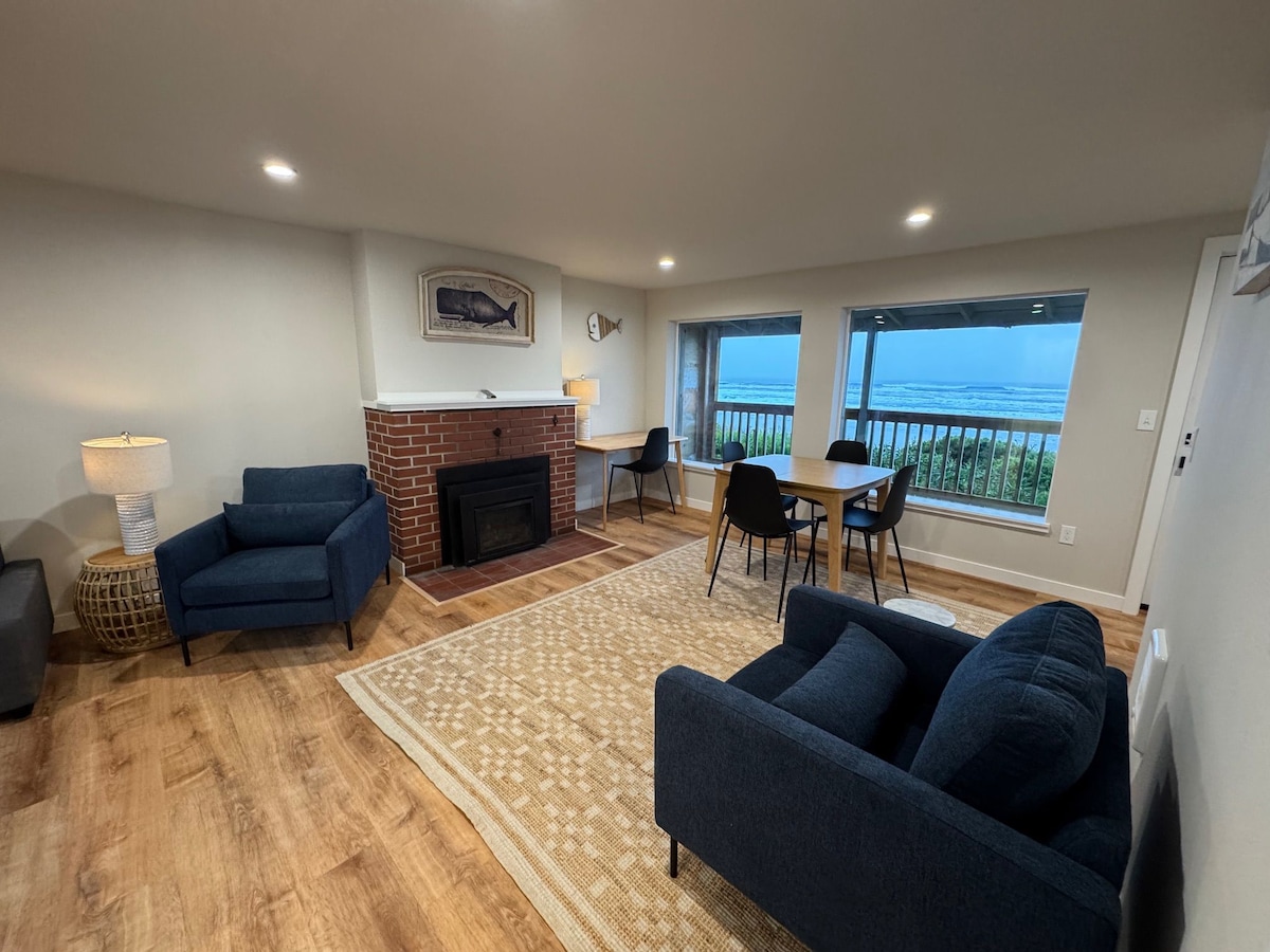 Experience the magic of the Oregon Coast in this freshly renovated oceanfront duplex cottage with gas fireplace, perfectly positioned on pristine Big Stump Beach. Step outside your door onto miles of sandy shoreline, where the rhythmic waves and coastal breeze create the perfect backdrop for your beach getaway. Inside, you'll find a thoughtfully updated interior featuring a fully equipped kitchen with modern amenities, including a dishwasher for effortless cleanup after seaside meals. The cottage accommodates up to four guests with a king bed in the bedroom and a full size sleeper sofa in a cozy TV nook off the living room. The covered oceanfront deck allows you to take in the sounds of the ocean while staying protected from the weather. The gas fireplace adds to the warm and inviting atmosphere throughout your stay. Your Perfect Base for Coastal Adventures: North to Waldport (minutes away): Dive into authentic coastal activities like crabbing from Dock of the Bay or McKinley's Oregon Coast Marina. During low tide, try your hand at clamming near the bridge. South to Yachats (just a few miles): Discover charming restaurants and explore remarkable rocky tidepools along the dramatic coastline. Further Explorations: Visit the fascinating Newport Aquarium (30 minutes north) or embark on an adventure at the Sand Dunes (45 minutes south) - accessible by foot, ATV rental, or guided tour. Traveling with a group? Cape Cod Cottages features eight additional units on the property, perfect for family reunions or friend gatherings. Shared amenities include: 300 feet of private beach access Entertainment-ready game room featuring foosball and ping pong Free guest laundry facilities Three EV charging stations
