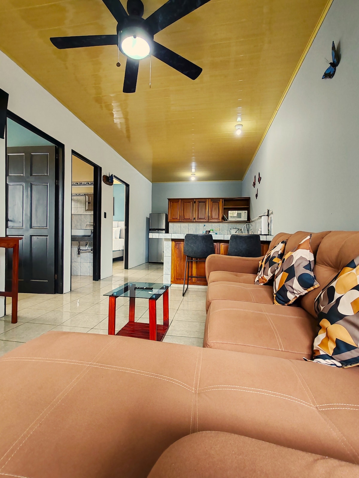 Apartamento completo, cómodo y espacioso. Una de sus habitaciones tiene una ducha enorme y muy agradable, la otra habitación tiene un escritorio con su silla y su lámpara ideal para trabajo o entretenimiento. Nos ubicamos a solo 700 metros del centro de La Fortuna, lo que nos hace perfectos para estar alejados del ruido de la ciudad, pero ideal para caminar a restaurantes, supermercados, cajeros, farmacia, etc.