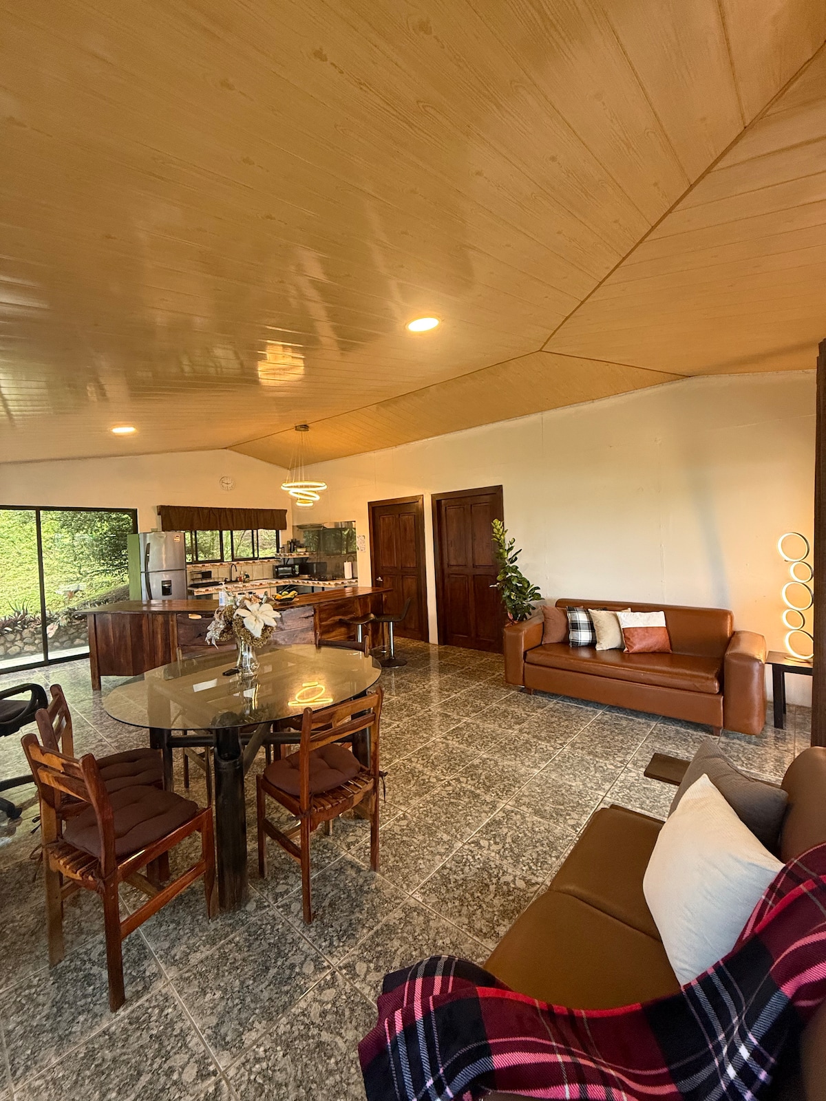 Escape to a secluded 1750 sq. ft. industrial-style retreat, nestled in a lush farm just 2 km from La Fortuna's heart. This unique, windowless open-concept haven features a king-sized bed, a queen-sized sofa bed, and a fully equipped kitchen. An air system creates a refreshing breeze throughout the house, complemented by A/C for perfect comfort. Enjoy the rooftop pool with sunbathing, grilling and bar utensils. Explore the nearby creek and savor the tranquility of 32,000 sq. ft. of private land.