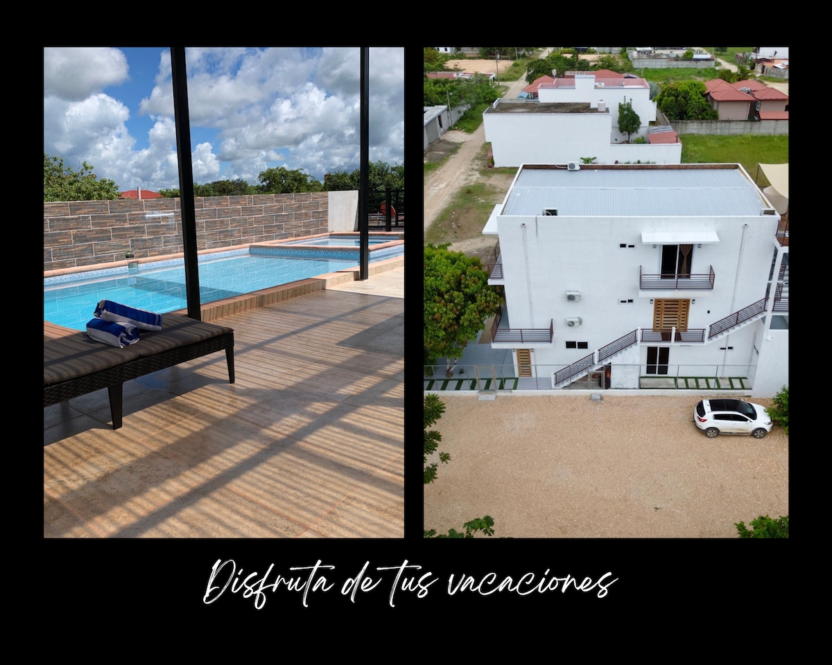 Linda casa para estar en familia y relajarse. Totalmente equipada. 3 hab. con A/C, ventilador, Sala comedor cocina, TV, bocinas, 2 baños, Agua caliente en duchas terraza con piscina/jacuzzi y BBQ , (puede comprar el carbón en la tienda de enfrente) con mesas y sillas de estar. Buena ubicación, varios restaurantes cercanos con comida variada, cerca del parque central y de la Iglesia, varias agencias de viajes para apoyarte en tu recorrido.