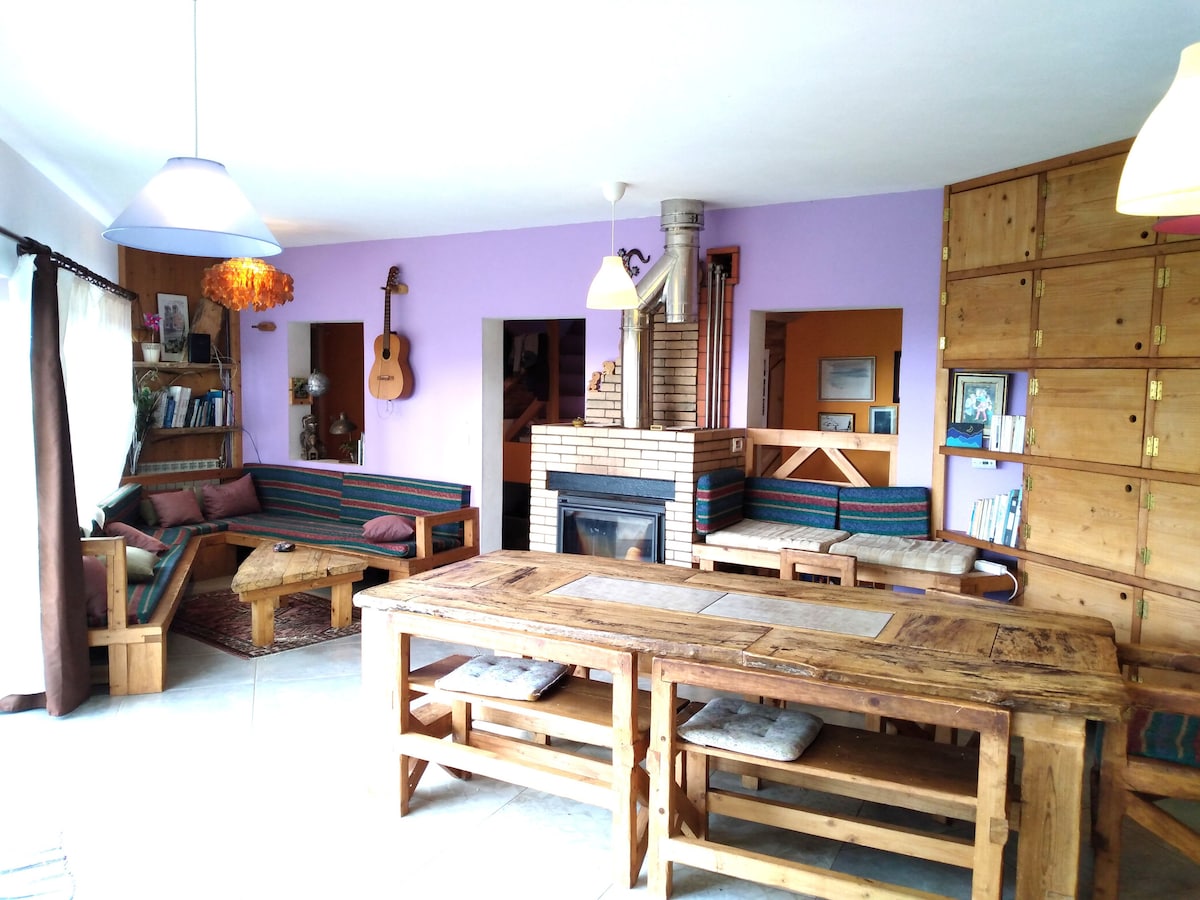 House facing the sea, consisting of two floors, with three double bedrooms. A living room and a sofa area upstairs (a sofa that can be converted into a bed for small young people), fully equipped kitchen, two bathrooms, private pond with frog concert, free parking.