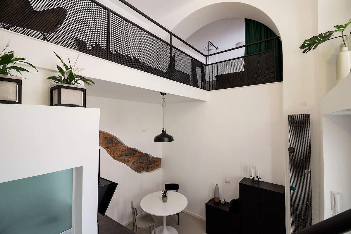 Si tratta di un moderno loft, nel cuore di una villa dei primi del Novecento. È stato appena restaurato e arricchito dalla presenza di mobili antichi. La zona giorno a piano terra con il divano letto e il camino funzionante; la zona notte si trova al piano di sopra, arricchita dall’utilizzo di un pavimento in castagno dell’Etna. Ampio antibagno con armadi su misura a scomparsa, moderno bagno con doccia extralarge. Spazi esterni ampi, giardino e piscina.