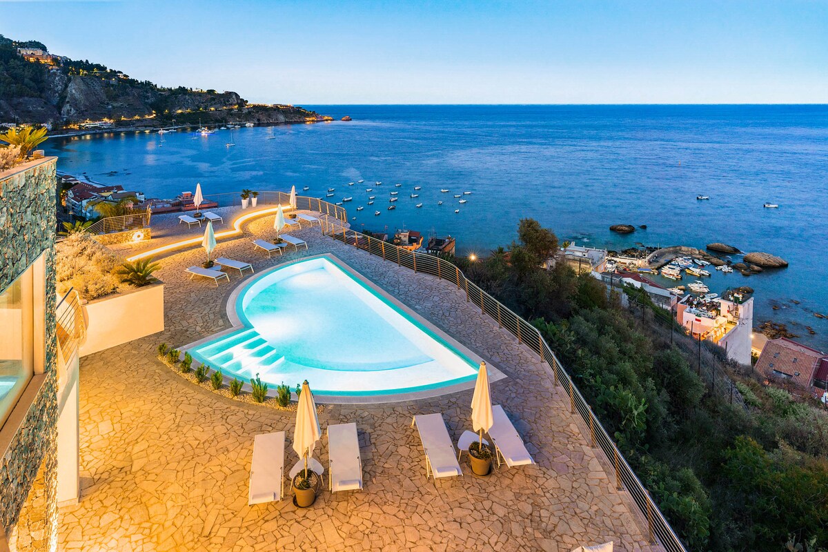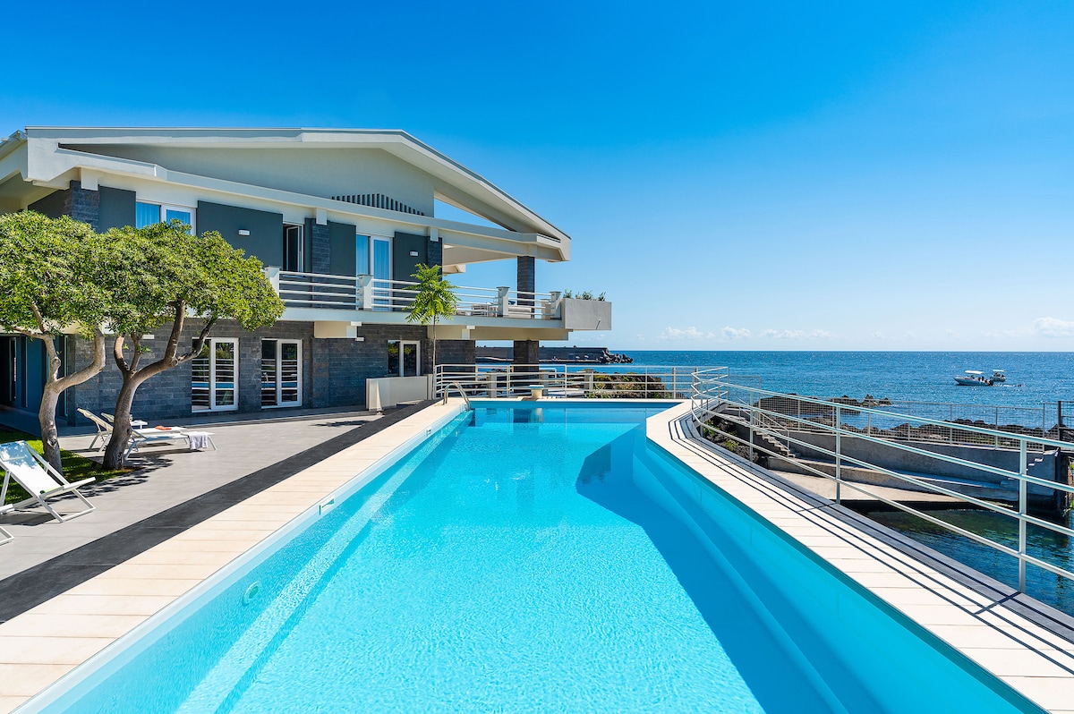 Rock formations frame the cove and a pool defines the waterfront at this sleek home on Sicily’s east coast. Terraces connect the house and pool, complete with outdoor sofas and tables, and loungers dot the lawn. Turquoise accents in white rooms bring the sea indoors, while picture windows in the kitchen feature Mount Etna views. Find restaurants and dive shops in the fishing village of Stazzo. Copyright © Luxury Retreats. All rights reserved. BEDROOM & BATHROOM • Bedroom 1 - Primary: King size bed, Ensuite bathroom with stand-alone rain shower, Bidet, Balcony, Ocean view • Bedroom 2: King size bed, Ensuite bathroom with stand-alone rain shower, Bidet, Balcony, Ocean view • Bedroom 3: King size bed, Ensuite bathroom with stand-alone rain shower, Bidet, Balcony • Bedroom 4: King size bed, Ensuite bathroom with stand-alone rain shower, Bidet, Balcony • Bedroom 5: King size bed, Ensuite bathroom with stand-alone rain shower, Bidet, Television GROUND FLOOR Bedroom 6: King size bed, Ensuite bathroom with en-suite tub, Bidet. • Bedroom 7: 2 twin bed with en-suite shower, Bidet. • Bedroom 8: 1 double bed with en-suite shower, Bidet. OUTDOOR FEATURES • Outdoor living space • Gazebo - Pool open 06.04 - 10.11. STAFF & SERVICES Included: • Linen change - twice per week Extra Cost (advance notice may be required): • Activities and excursions • Masseuse • Babysitting service