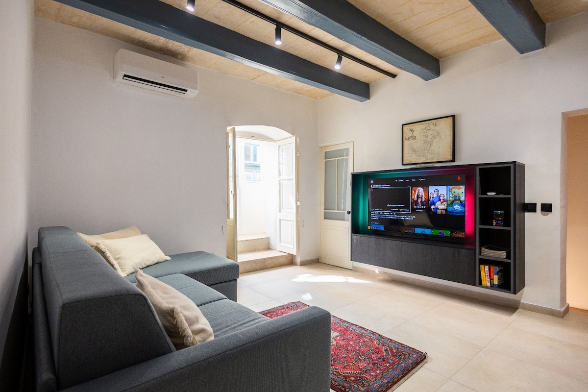 A beautifully restored 400 year old small house situated in the heart of the historical city of Cospicua, one of the fabled three cities across the harbour from Malta's capital, Valletta. The space is warm and has been stylishly restored and furnished. The ground floor leads into a living room with a sofa bed, a kitchen/dining room and a guest toilet. The bedroom with a king size bed and an ensuite bathroom together with a terrace are on the upper floor. This floor is reached via a staircase.