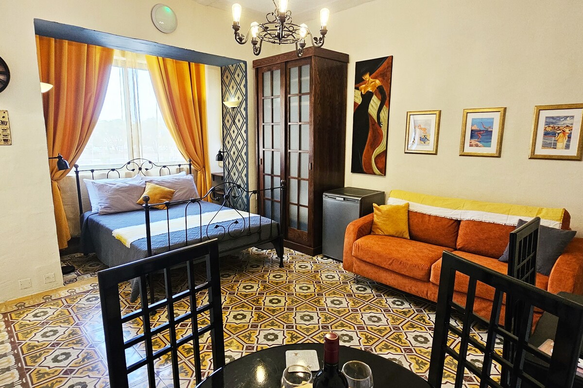 This Studio flat is newly renovated having a mix of modern and antique concepts. It is situated in the heart of Floriana having a clear view of the historic Valletta Harbour. This old and quiet village, is 5 minutes walking distance away from Valletta which was the capital city of Europe in 2018. The bus terminus is 2 streets away with a 1 bus catch to anywhere in Malta. The studio flat accommodates 3 adults or 2 adults and 2 children, it has 1 double sized bed and a sofa bed with 1 bathroom.