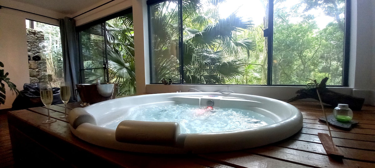 带水疗的玻璃屋。大自然、宁静、景观、海滩