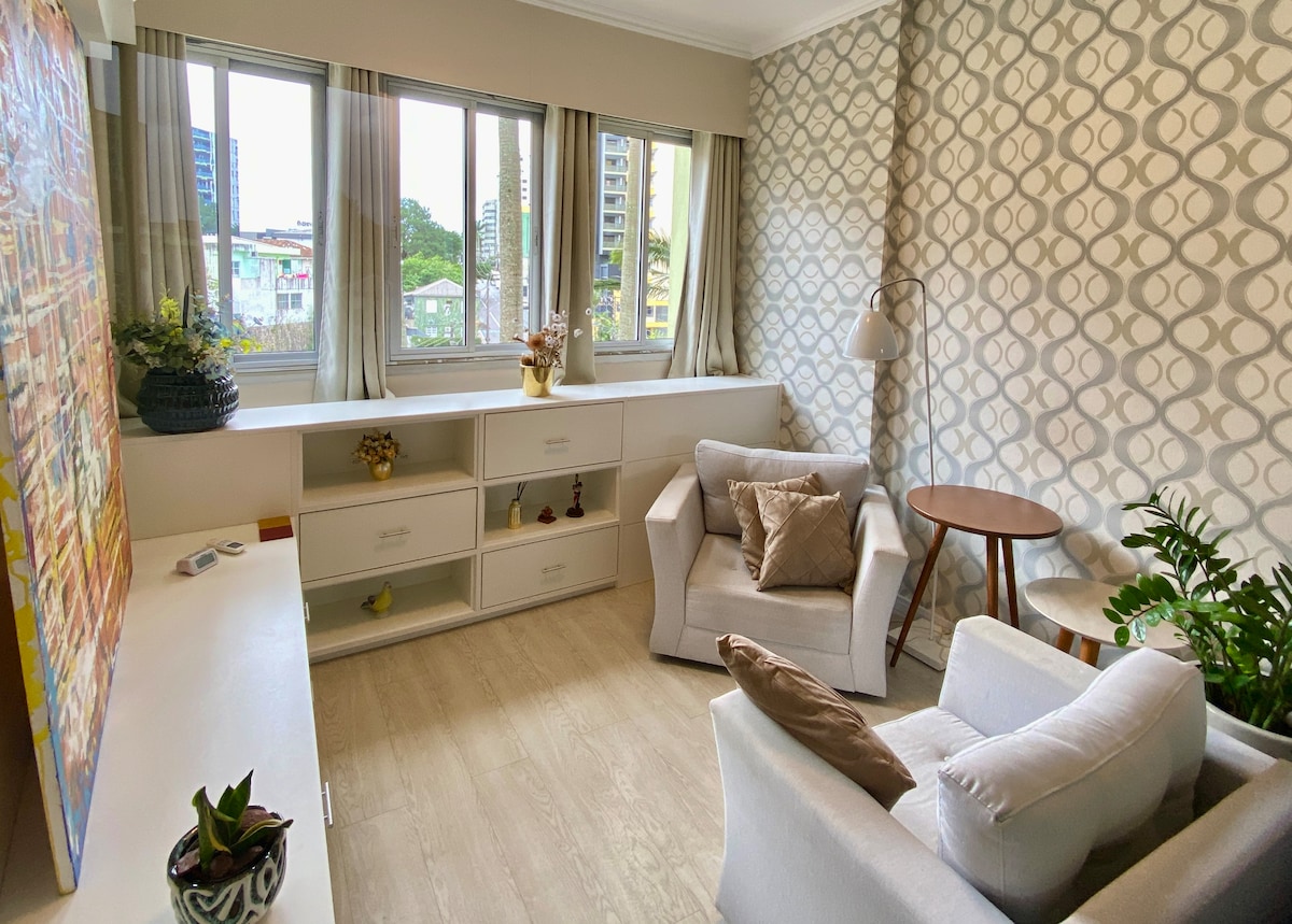 Studio novo de 30m² com decoração em estilo Folk, ideal para quem busca trabalhar ou estudar. Cozinha completa com eletrodomésticos novos (fogão de indução), TV Smart de 43”, duas redes de Wi-Fi de 200 mega (fibra óptica) e ar-condicionado de 18.000 BTUs. Local tranquilo, seguro e aconchegante, com garagem coberta. A menos de 100 metros de padaria, farmácia, mercado, barzinhos e sorveteria. Localizado entre o Centro e a Lagoa da Conceição, próximo à UFSC, UDESC e UniSociesc.