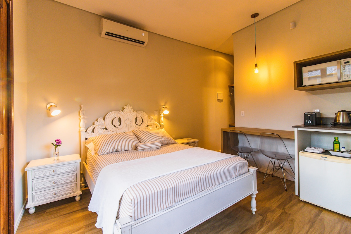 Suíte aconchegante com 1 cama de casal, TV a cabo, internet, roupeiro e mini copa equipada com frigobar, micro-ondas, chaleira elétrica, louças, etc. Toda montada com carinho para que sua estadia seja perfeita. Acesso independente à suíte. Passando por uma pequena trilha no final da rua, você escolhe a direção para qual praia desfrutar: o Canto Sul dos Ingleses ou as ondas da Praia do Santinho. Caminhando por Dunas e uma reserva natural, em 7 minutos você chegará a uma dessas lindas praias.