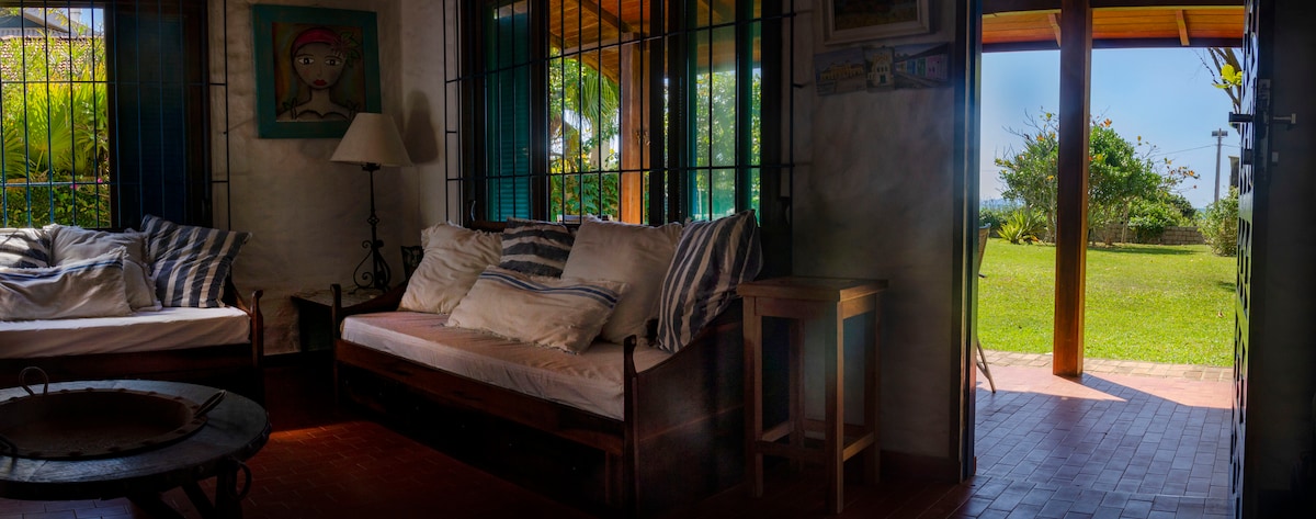 Casa totalmente ensolarada e arejada, janelas com vista para o mar, praia a 30 metros da casa, toda comodidade, Hi-Fi, Tv na sala , cozinha equipada, lavanderia, Churrasqueira interna, varanda, rede disponível, porta de acesso a sala e acesso aos quartos individuais, estacionamento, local para esporte gramado, chuveiro de praia. Mercados próximos, posto de saúde, restaurantes, passeios de escuna. Praia tranquila para banho e esportes aquáticos.