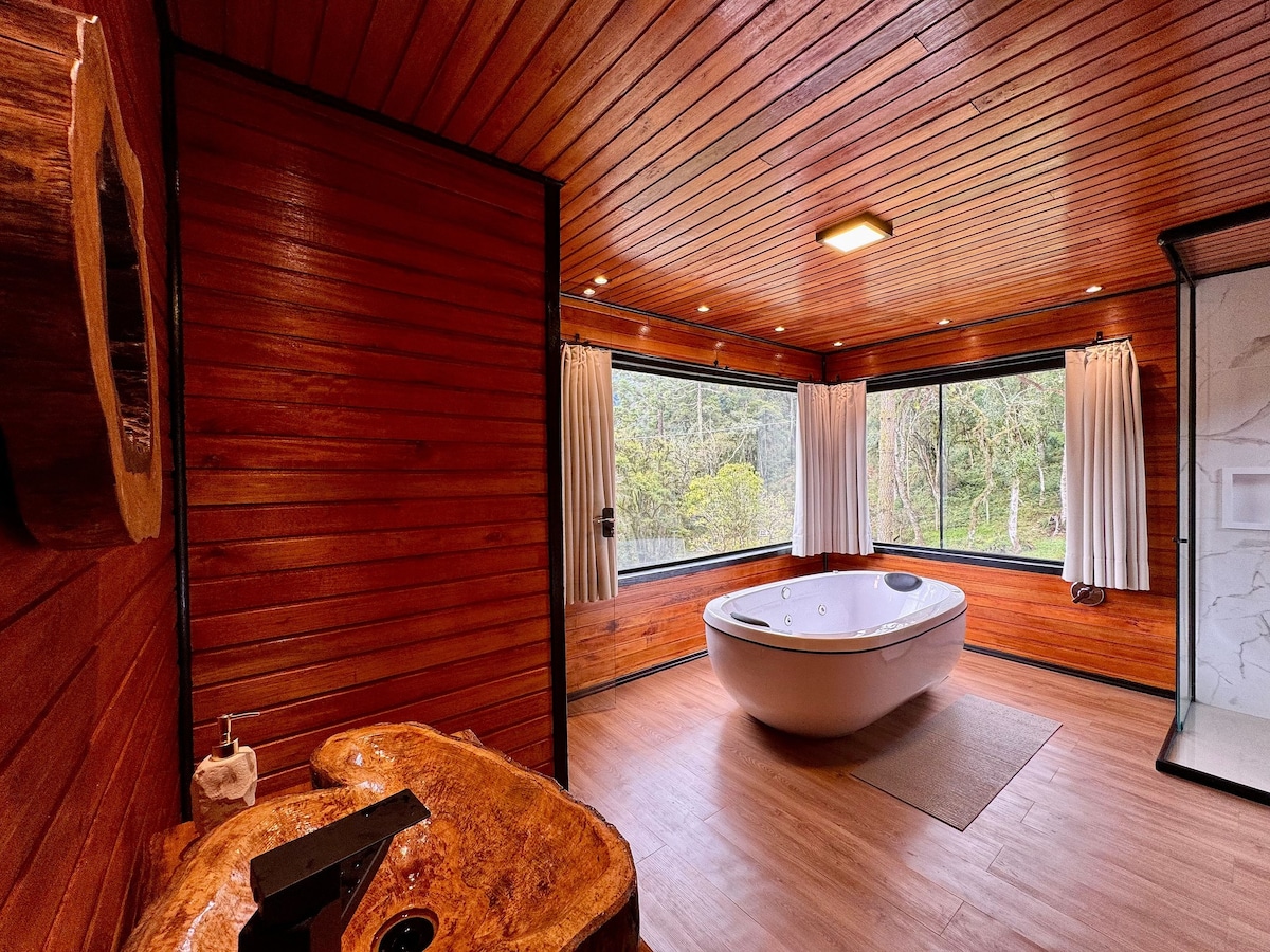 Desconecte-se da rotina em uma experiência única neste chalé aconchegante cercado pela natureza. Ideal para famílias, casais ou grupos de amigos, o espaço acomoda confortavelmente até 6 pessoas e oferece todo o conforto necessário para momentos de descanso e conexão. A banheira de hidromassagem é perfeita para relaxar curtindo o visual da mata. O chalé conta com ambientes amplos, incluindo cozinha completa, sala com lareira, varanda com vista para a paisagem e quartos confortáveis.