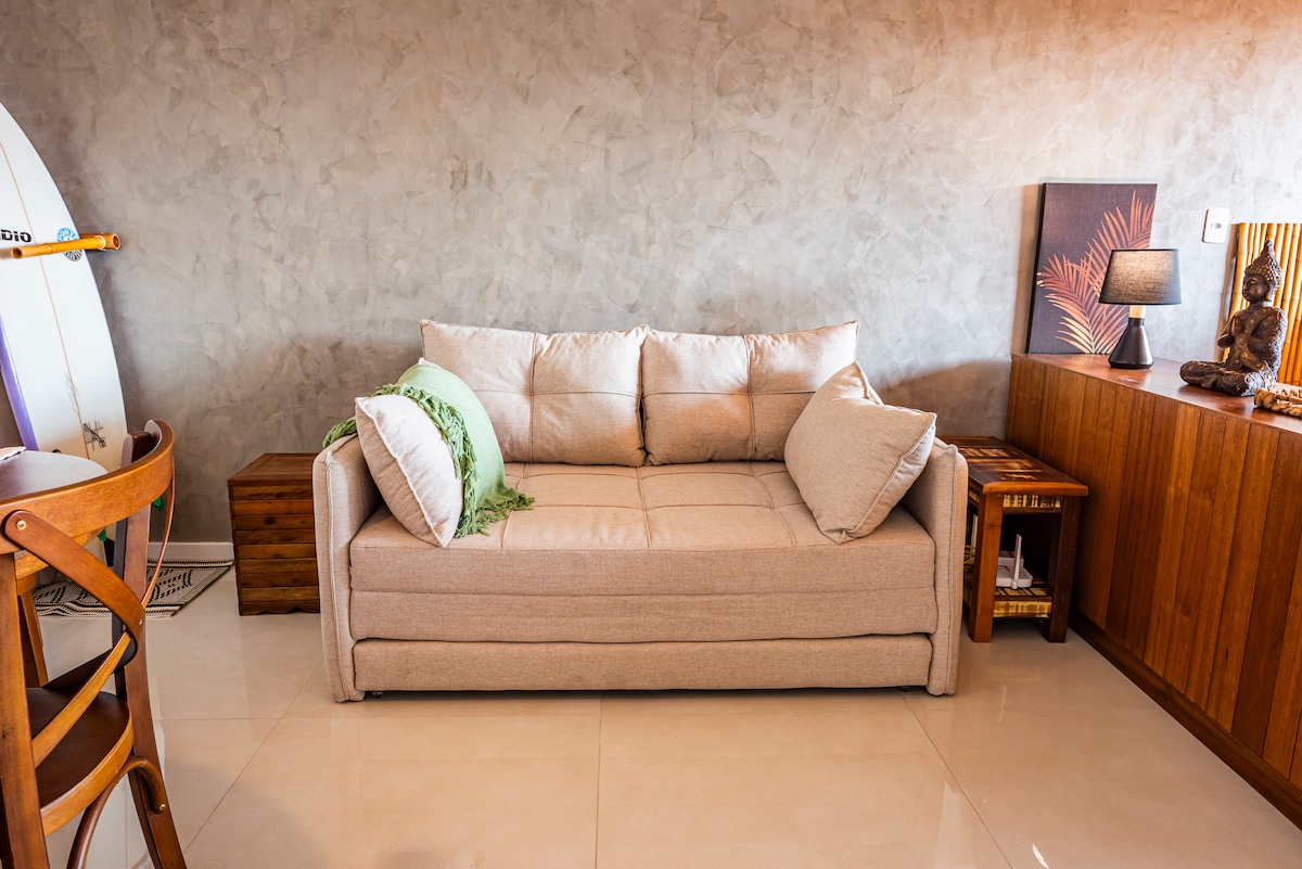 Studio amplo, confortável, espaçoso, aconchegante, prático, privativo e seguro. Pensado para receber casal jovem, de bem com a vida, amante da natureza e praias. 5 minutos da praia de carro (2 km) 1300m do centrinho. -Cama casal box queen (grande e deliciosa) -TV 32 Smart -Wi-fi estável fibra 100mb -Cozinha completa e funcional -Varanda gigante e privativa para relaxar na rede e curtir o pôr-do-sol - Banheiro grande, box de vidro, pia de granito delicioso banho - Ar cond. Quente e Frio :)