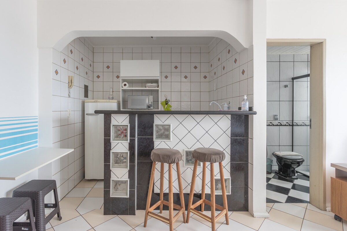 Apartamento studio em condomínio uma quadra mar, 100 metros praia. Em condomínio privado com fechadura digital, segurança 24 hs, piscina, academia e lavanderia. Wi-Fi 500 mega, Tv 55 polegadas . Varanda, quarto, sala, banheiro, cozinha equipada, sala c tv ,ar condicionado. Tem uma vista livre a frente e uma pequena vista do mar. Decorado, compacto e climatizado. Ambiente tranquilo, organizado e calmo. Estacionamento privativo com área coberta. Descanse, desfrute ou faça seu home office.