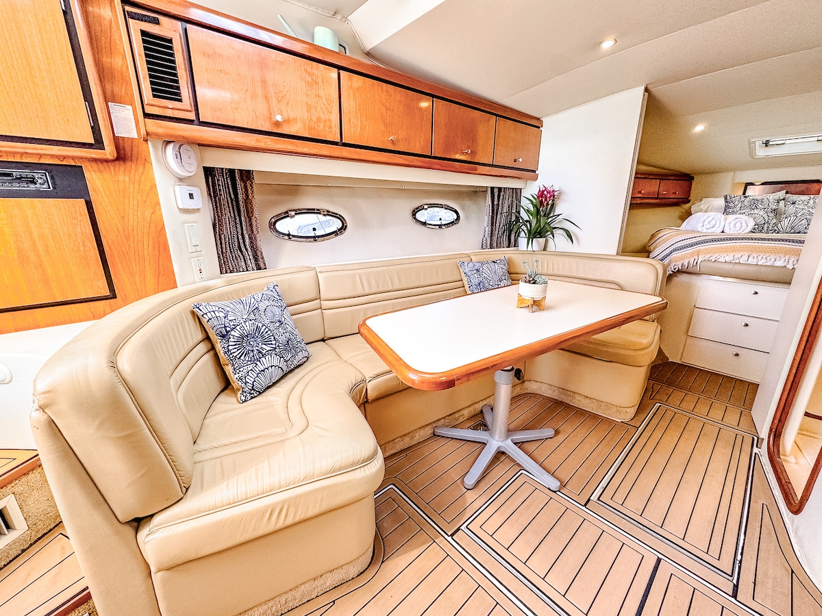 Stay aboard the eco-friendly two-story 63 ft River Queen with a 360 degree view with beautiful sunrises and sets, mored 1/8 mi offshore in a quite harbor close to shopping center, movie theater, hospital, bars & restaurants. A 10-foot dinghy with small outboard to come & go from shore "ONLY", nowhere else. I also offer Personal Training, deep tissue work & Life Coach sessions. I live on the vessel about a hundred yards from you so if there are any questions, etc. I will be there to assist you.