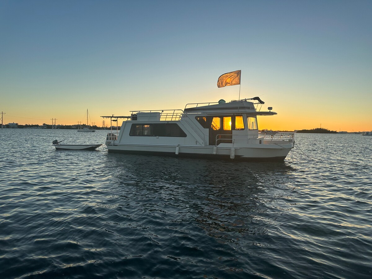 IMPORTANT Enjoy your own private retreat aboard a solar and wind powered houseboat moored 1/2 mile from land in the beautiful Islamorada Please do not arrive after dark and NO night riding. Need experience with hand pull outboard motors a 12 foot skiff with a 6hp outboard motor is provided reliable to go back and forth from shore NOT reliable for exploring No hot water on shower, heat water in Tpots or Solar bags. Please shave before arriving No suitcases, least amount of cloths.