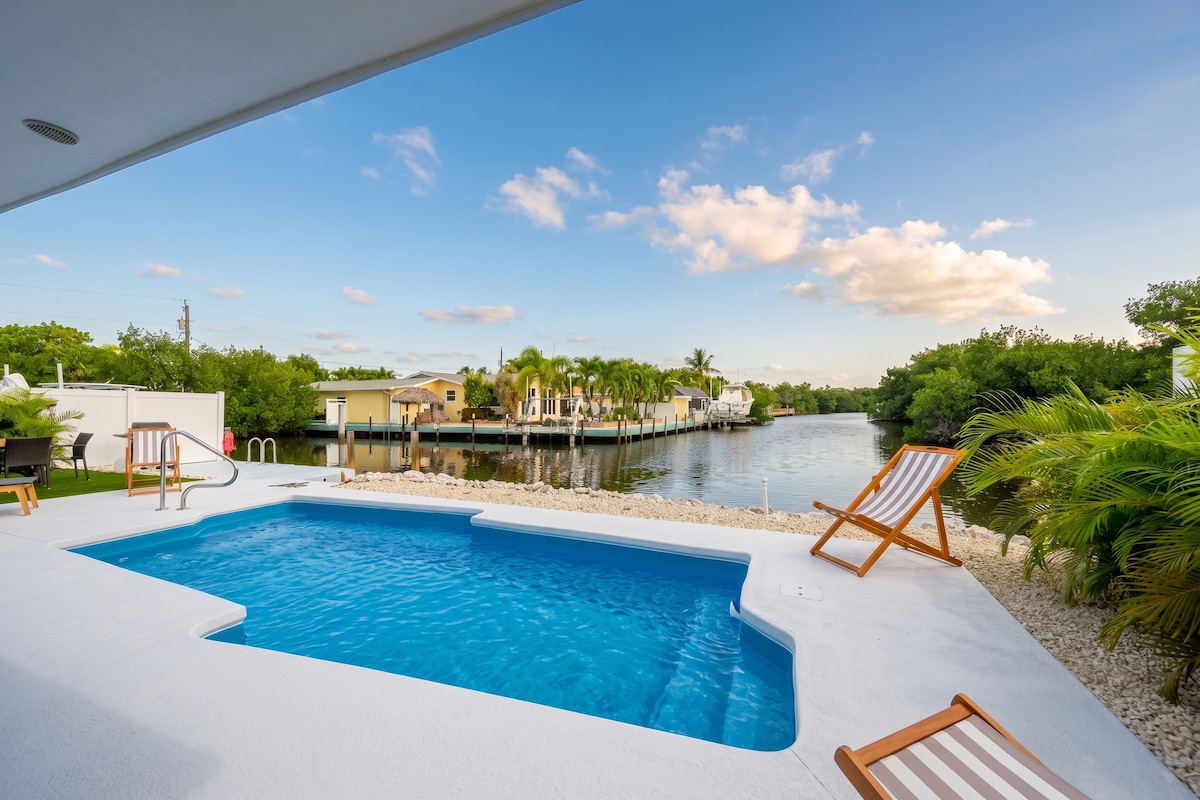 Beautiful Key Colony Beach waterfront duplex with a private pool! Featuring a newly updated, 3/2, spacious 1440 sf home, deep water private boat slip & lift, Tiki Hut w/TV, kayaks, pet friendly, ice machine, bait freezer, large kitchen, Cabana Club, restaurant, and beach access. Family friendly location w/Golf, a playground, and dog park. Sit under the tiki hut, watch the game on the outdoor TV after a day on the water, & grill your catch. Relax on the upper deck sunbathe and enjoy the vistas!