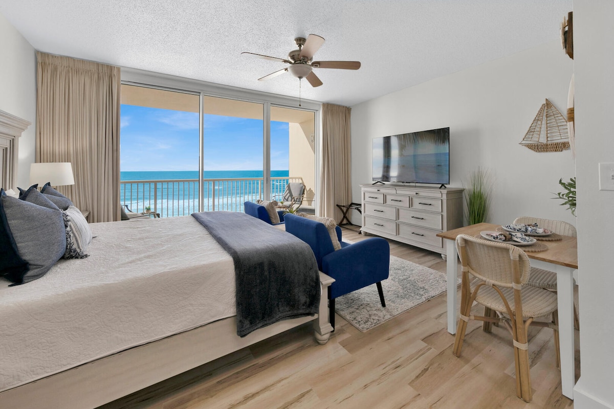 Located in Tower 1 on the 9th floor, our studio offers breathtaking, unparalleled panoramic views of the Gulf of Mexico. This oceanfront condo features standard furnishings and ample space, making it the perfect opportunity for a romantic getaway in one of PCB's most popular resorts: Majestic Beach Resort. This space will feel like a hotel just feet away from the beach. Beach service is included (2 beach lounges and 1 umbrella) from March 1st to October 31st, valued at $60 per day.