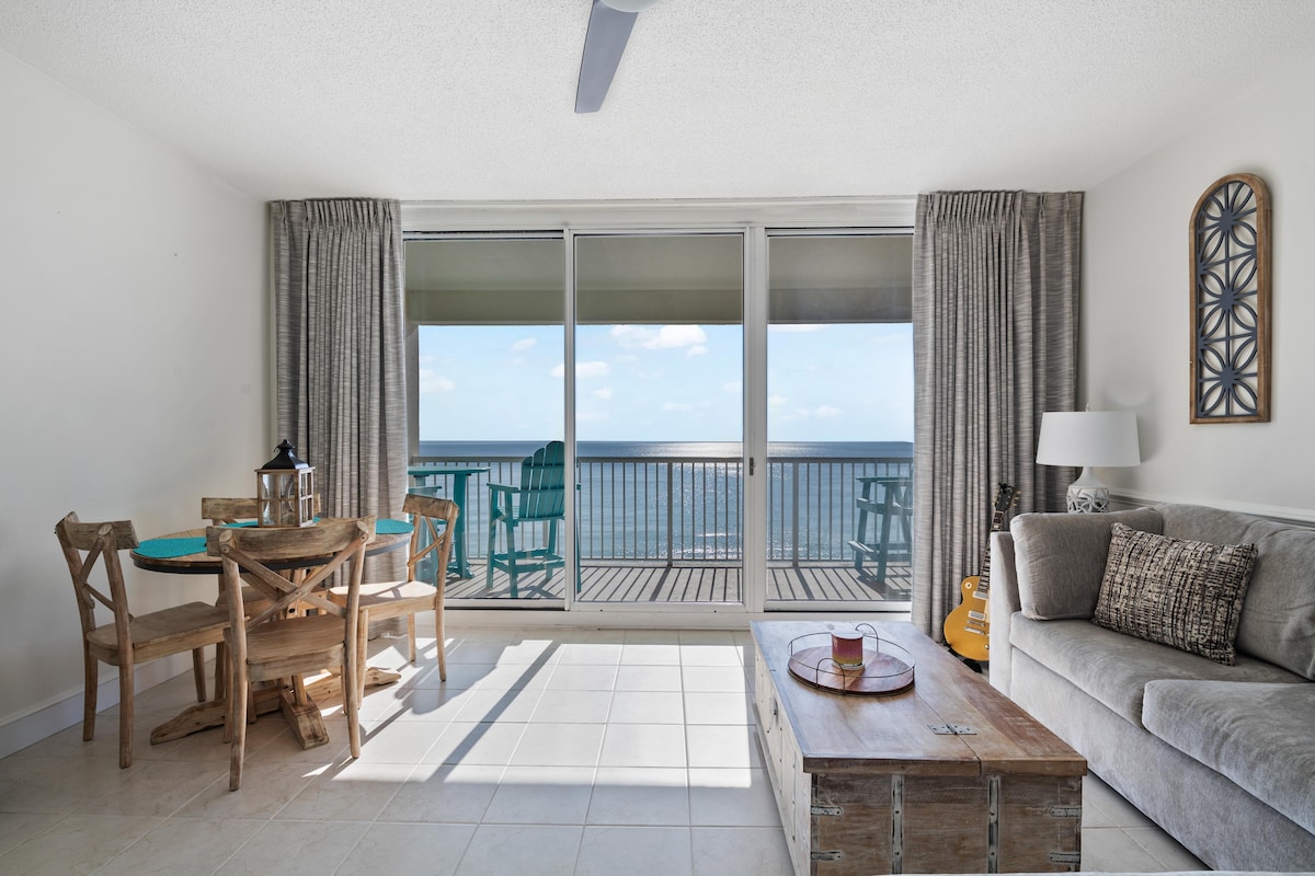 8th fl. stylish open studio w/stunning VIEW, beachfront in Sandestin Resort between Destin & 30A. 🛺 Golf cart with 3+ nts. NEW Pool & Hot Tub. West Elm furniture & King size bed w/ocean view. Sleek Kitchen w/dishwasher & Keurig. WiFi, 55” smart TV. Washer/dryer. Huge balcony to gaze @ the sea. Enjoy the beach, dining, shopping, trails, golf & entertainment all without leaving the resort. Tram pass & Gym. Perfect for honeymoon, baby moon, girls trip, solo travel or lil family vacay *no animals
