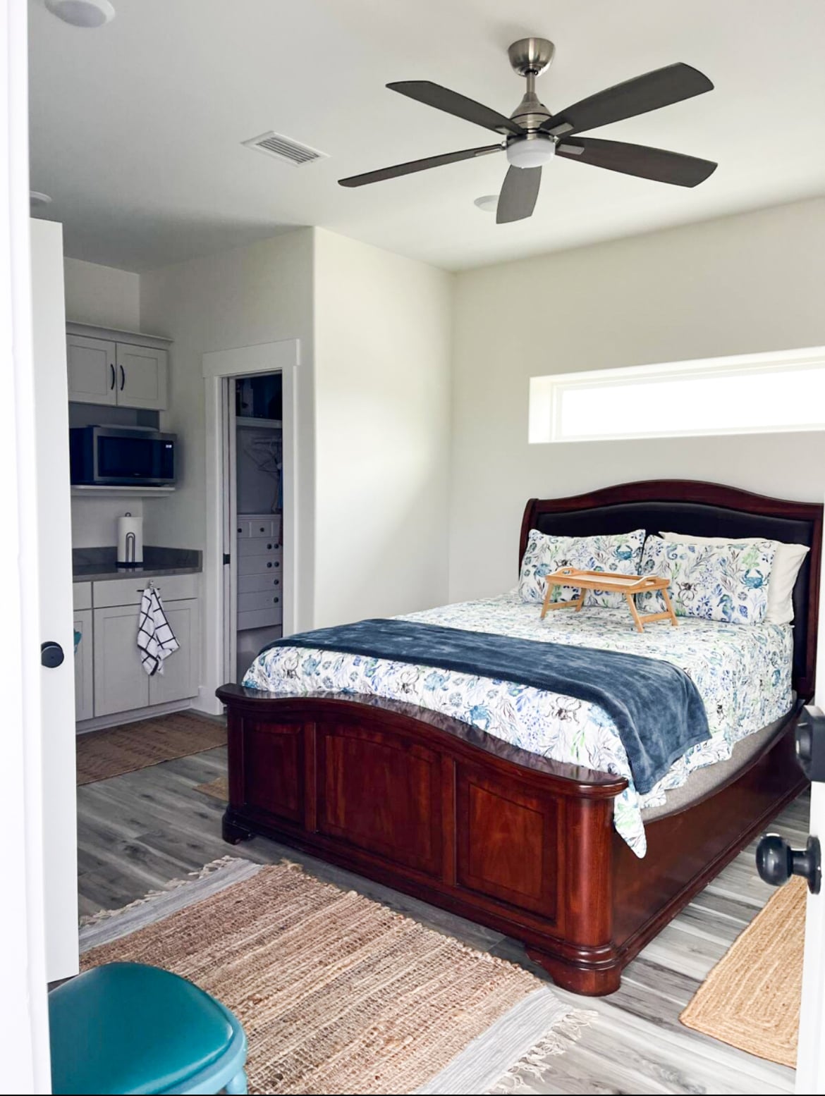 Excellent location, minutes from beautiful beaches. Private, new addition; no entry through home; entrance through French Doors off of private deck with chairs. Guest suite over 400 sq. ft. with 2 full beds, sleeps 4 plus an additional air mattress. Efficiency kitchen, full refrigerator with ice maker, microwave & coffee maker. Dining table. Big screen TV, wifi, walk-in closet. Full bathroom. 5 minutes from Wal-Mart Supercenter. A few minutes from restaurants.