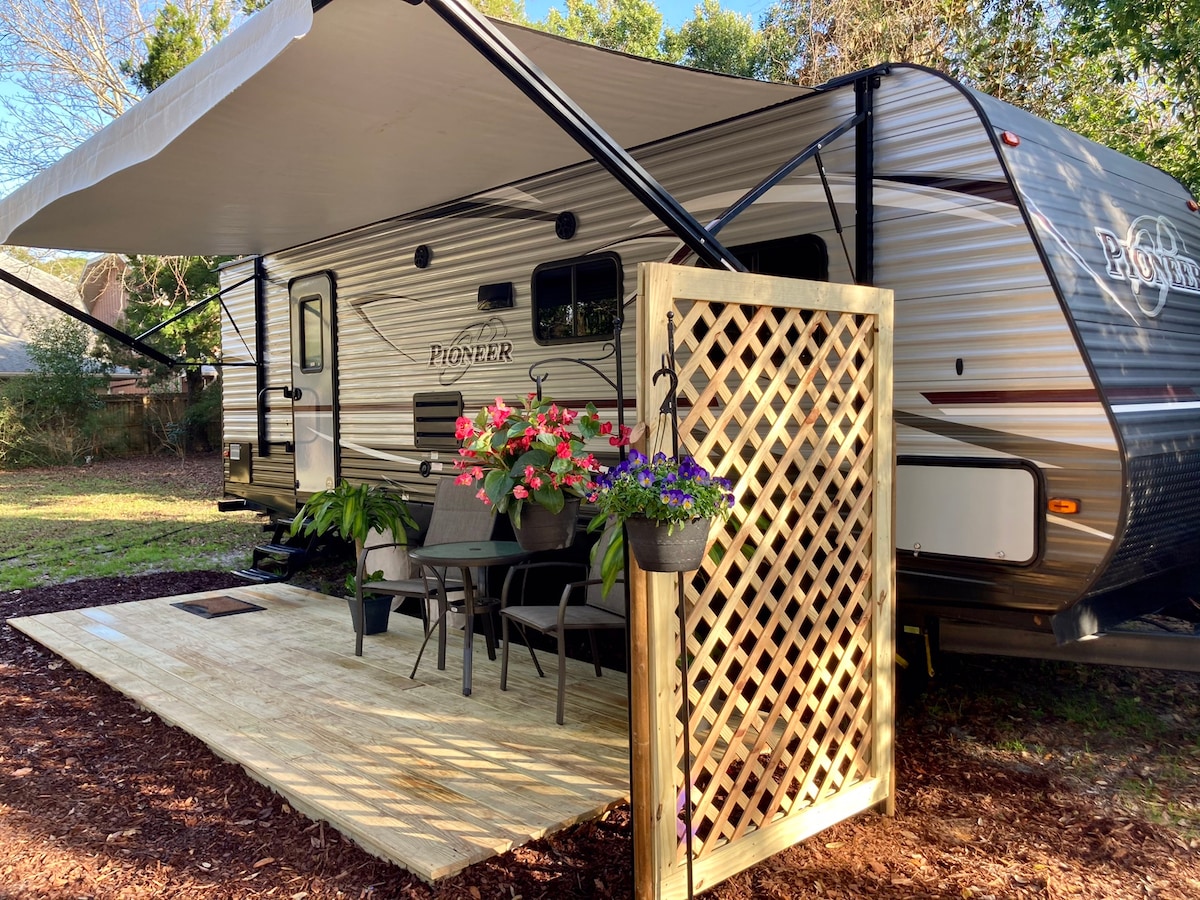 Large, clean camper with lots of space in a quiet neighborhood. Double lot with another house but you have your own private spot w/ plenty of free parking and a wide driveway. (Enough room for a boat or multiple cars.) Lots of space to let kids play. BT radio with outdoor speakers. Outdoor Kitchen with sink and mini-fridge. All necessities are provided as well as clean towels, linens and extra blankets. 1.5 mile drive to the beach and 7 miles to Frank Brown Park/Pier Park