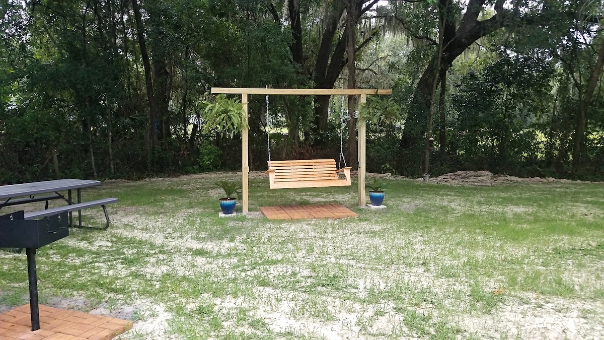 KT’s Cottage is located just minutes outside the city limits of Historical Downtown Live Oak and the beautiful Suwannee River. If you are passing through for business or to enjoy the area, I hope you will find our cottage’s accommodations are more than satisfactory. There is a queen bed downstairs as well as a queen in the loft, with plenty of extra pillows and blankets for your comfort. Coffee, tea & bottled water are included. Enjoy grilling while relaxing in the swing or sitting by a campfire