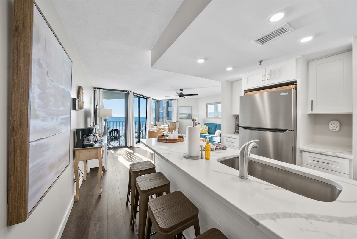 West side of the resort is going through a renovation project until May-2026. Our unit is on the East corner with least impact. Some amenities will be impacted. 12th-floor 2Br/2B/WD corner unit. Panoramic Gulf views east and south from the living room, and stunning beach views from the master bedroom! Fully renovated, professionally decorated in a coastal theme, and fully stocked for comfort. True beachfront building—no streets to cross.