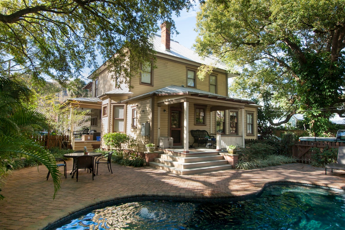 Experience Tampa from our little slice of Heaven right in the heart of Tampa Heights. This is a detached private Pool House in our backyard. At 264 sqft, It has a full Bath, Kitchen, and studio space with a Queen memory foam mattress, and work space / breakfast table. Enjoy the Pool and its tropical surroundings or just relax in a lounge chair. We are walking distance to Lee’s Pizza, Armature Works, River Walk, and much more... Included is a smart TV, WIFI, and Two Bicycles to go explore.