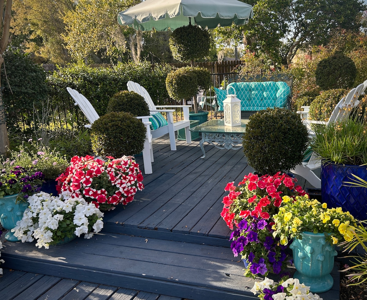 SPACIOUS 1 BEDROOM STUDIO Perfect for a ROMANTIC GETAWAY BUSINESS TRAVEL/SEASONAL RENTAL The side walkway leads to your private studio suite entrance offering a spa like bath complete with double sinks vintage shabby chic mirrors full size washer dryer tub with shower and storage closet. Decorated in Provence lavender colors the main room of the studio offers kitchenette bistro set sofa walk in closet smart TV and queen bed.