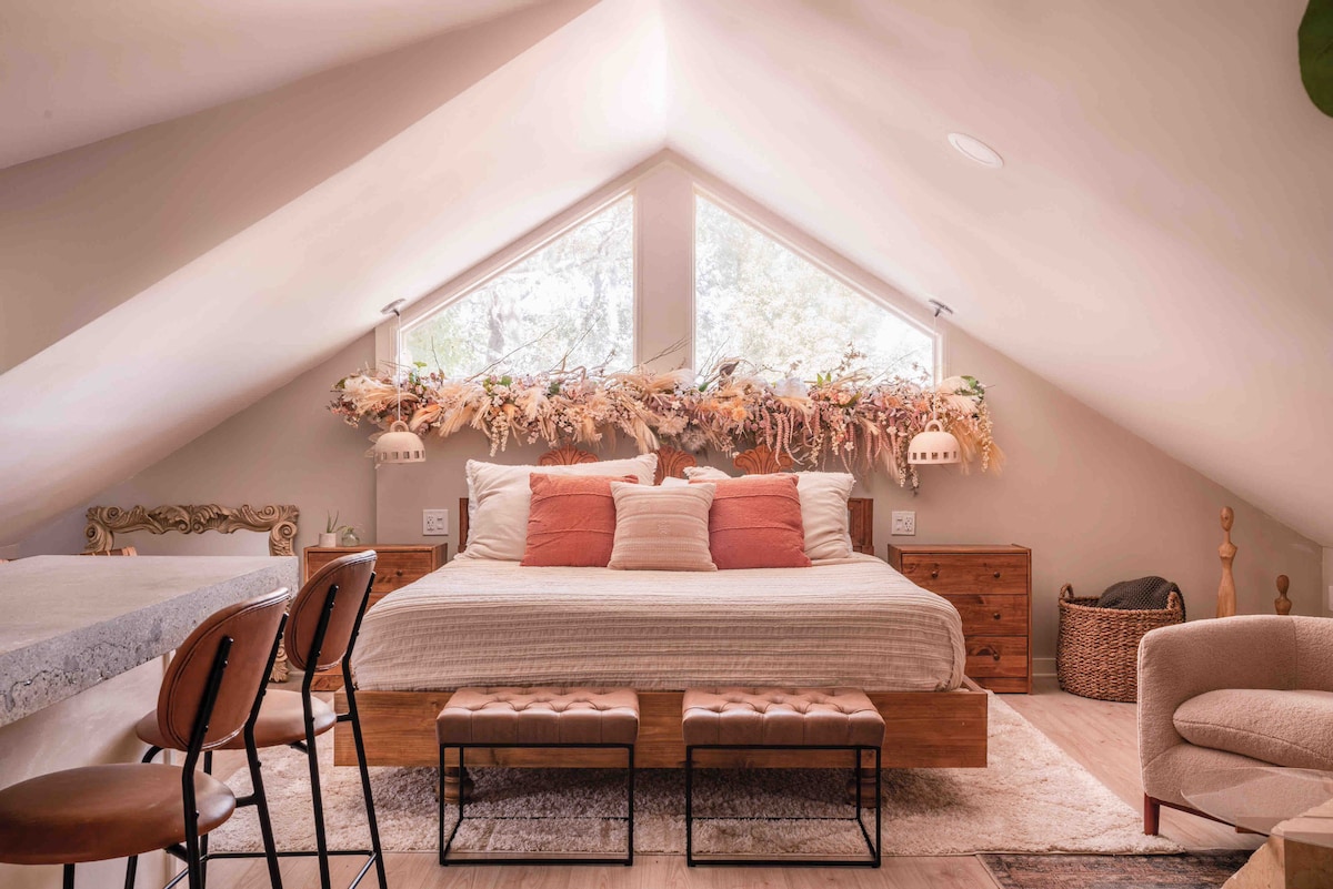 Moroccan-Inspired King Suite | Smart TV | Fast Wi-Fi | Pool Coming March 2026 Escape to a Moroccan-inspired oasis ideal for couples or solo travelers. This stylish efficiency features a luxury king bed, private en-suite bath, coffee station, mini fridge, 55” Smart TV with top streaming apps, and fast Wi-Fi. New resort-style amenities coming March 2026 include a pool, hot tub, and outdoor kitchen. Book solo or combine into 2- or 3-bedroom options for groups.