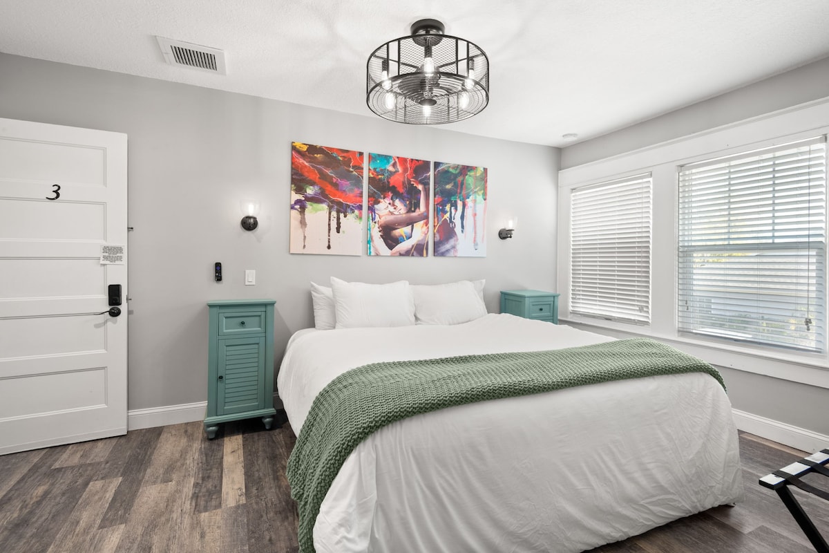 The king room is our smaller economical option at 220 sq. ft. It's made for travelers to save money and doesn't face the ocean. We also have 450 sq. ft. studios & oceanfront suites for just a bit more. We're a small historic boutique hotel in Fort Lauderdale Beach, 60 ft from the ocean. We have a rooftop terrace and 2nd fl terrace. We have free beach gear, free WiFi, and $10+tx/day parking for a small or midsize car. The main guest MUST be 25+ so families don't have to worry about parties.