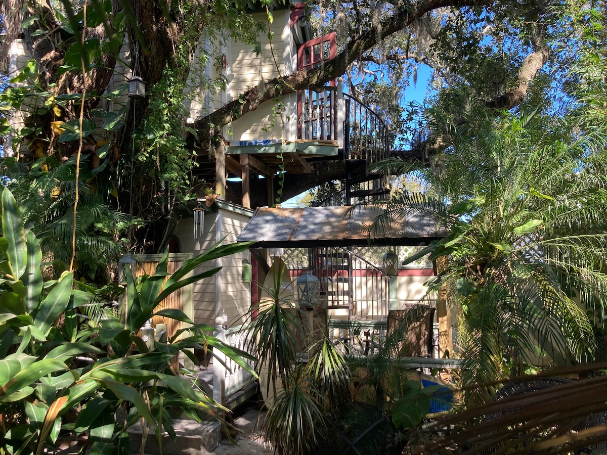 You have found your cozy oasis tucked in a (Real) Treehouse lodged in Ancient Oak. Set in a lush tropical garden in the historic district. It’s a minimalist’s dream, exemplifying the appeal of tiny living: compact, clean, efficient and 2 1/2 blocks to the historic districts shopping and restaurants. Relax on the Sun Deck, Rain Deck or in the Courtyard’s Tropical Garden The day time peaceful beauty is only eclipsed by the the nighttime display of laser lights projected onto the oaks canopy.