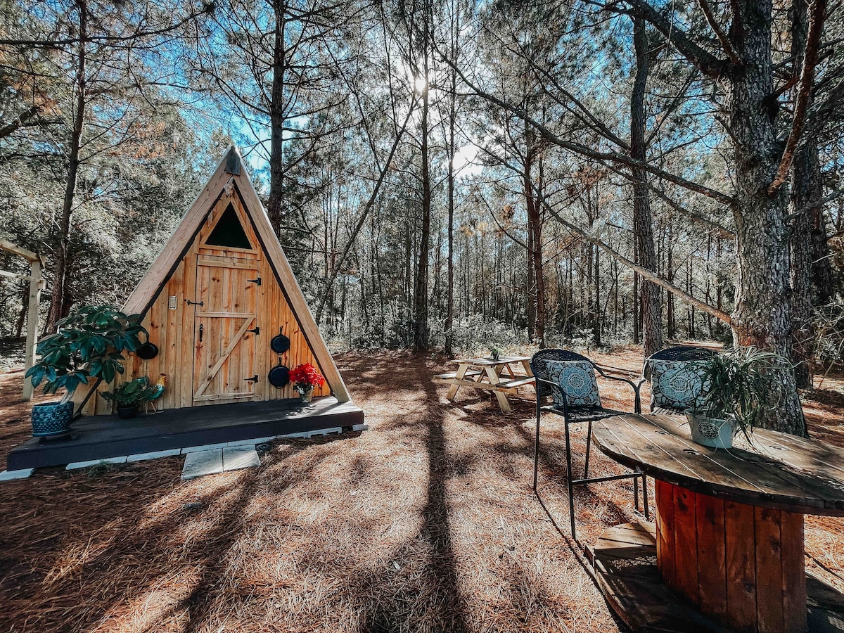 Welcome to our A-frame cabin, nestled in charming Old Florida Woodlands. It’s complete with two cots, a hinged wall/awning, fire pit, lounge chairs, a hammock, and a picnic table. From this soft pine-needled space, enjoy the view across the pond, go explore the seasonal garden, feed the fish, and meet our farm dogs. Mostly, enjoy ease and reconnection nature encourages. Due to severe drought this year, the pond is currently very low. However, you can still spot koi, bass, and brim. 🙏🏼