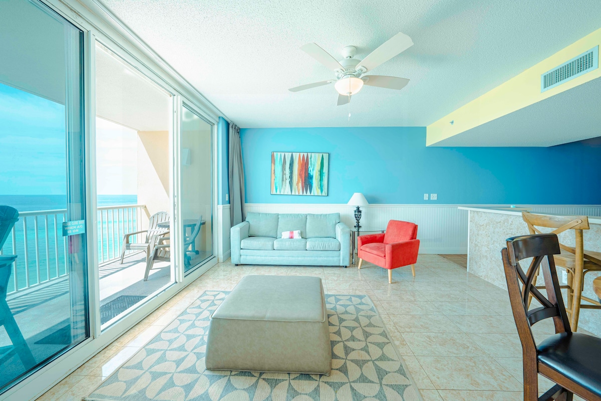 Located in Tower 1 on the 9th floor, our studio offers breathtaking, unparalleled panoramic views of the Gulf of Mexico. This oceanfront condo features standard furnishings and ample space, making it the perfect opportunity for a romantic getaway in one of PCB's most popular resorts: Majestic Beach Resort. This space will feel like a hotel just feet away from the beach. Beach service is included (2 beach lounges and 1 umbrella) from March 1st to October 31st, valued at $60 per day.
