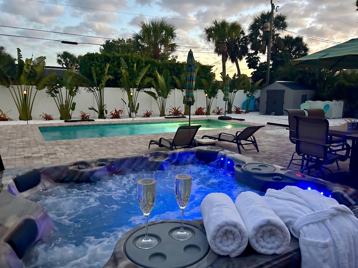 Live the island dream in your private tropical oasis 🌴 Walk to the beach & Sharky’s, then unwind in your own spa-style retreat designed for relaxation and outdoor living. This cozy micro escape features a Tommy Bahama queen, kitchenette, an expansive backyard with pool, 46-jet hot tub, outdoor kitchen and open-air shower. Just 1.2 miles to historic Venice downtown with dining, boutiques, and charm. Perfect for a romantic getaway or a peaceful solo reset. See photos for the full experience!