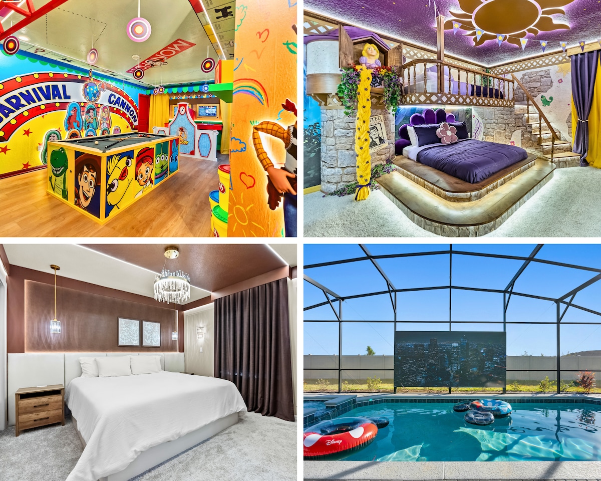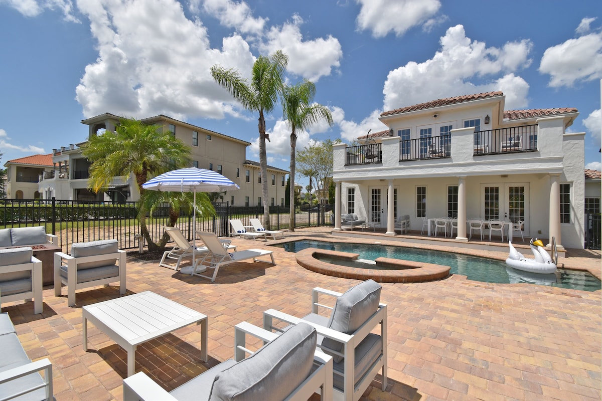 The perfect balance of STYLISH DESIGN, LUXURIOUS COMFORT, & ENDLESS ENTERTAINMENT in the stunning 3.5 square mile Reunion Resort. You will have your own private pool, spa, movie theater - game room, 3 master suites, 3 incredible themed bedrooms (MARVEL, FROZEN II, NASA) for kids or adults, the latest Xbox Series X game station, a 2500 ft2 pool deck overlooking a beautiful forest and pond, fire pit, & billiards table, minutes to Disney.