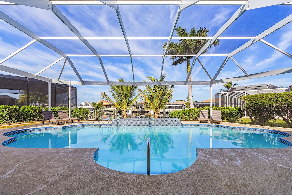 Are you looking to swim, relax outdoors, fish and take in beautiful sunsets on a wide gulf access canal? If so you will fall in love with this stunning newly constructed custom built home! The 2750 square foot home is bright & airy with two main bedroom on-suites & a separate family wing! The gourmet kitchen, dining room & great room open via large sliders to the lanai & pool w/ views of the canal in much desired SW Cape! Beach inspired villa! Large captains walk & Tiki! Check out our reviews!