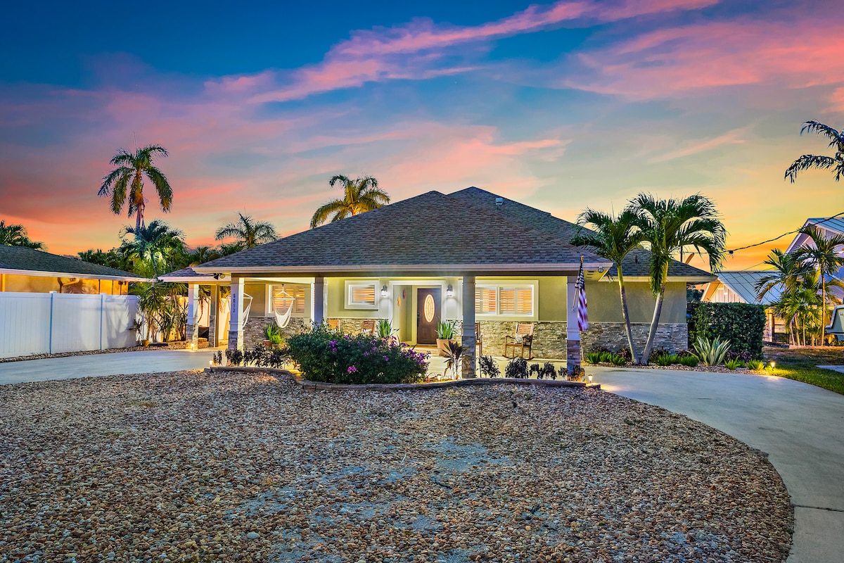 -All you need private retreat, 1 mile to downtown Cape Coral, 20 min to downtown Fort Myers & 25 min to Sanibel -Canalfront with heated pool & infinity-edge spa -Steam shower & spa-style toilets for a touch of pampering -Putting green & kayaks for outdoor family fun -Jet ski lift & 55’ boat dock—bring your water toys! -4 bikes for exploring the neighborhood -Garage gym -Tiki hut & outdoor lounge for family hangouts -Game room with pool table, shuffleboard, piano & karaoke—endless entertainment!