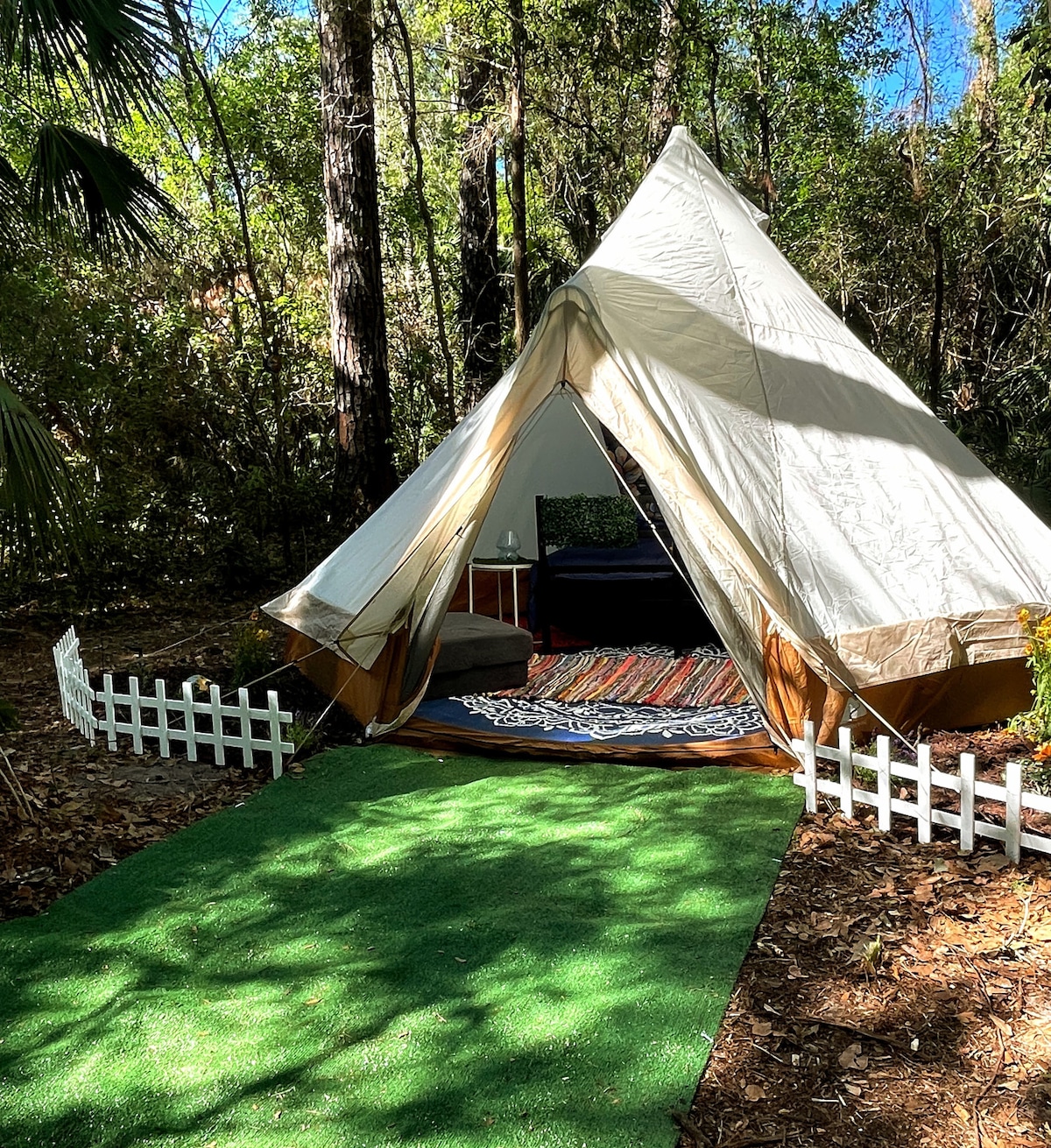 Unwind at Serenity Acres, your private glamping retreat, nestled amidst 10 acres of woods and fields. Enjoy Florida's cooler nights by the fire, and the warm sunny days. Our spacious 20' bell tent offers all the comforts of home, including a plush king-size bed, a cozy seating area, air conditioning, and heat. A full bathroom is located on the property for your personal use only, as tent guests. Shower under the moon with unlimited hot water! Relax at the fire, under the bright country stars!