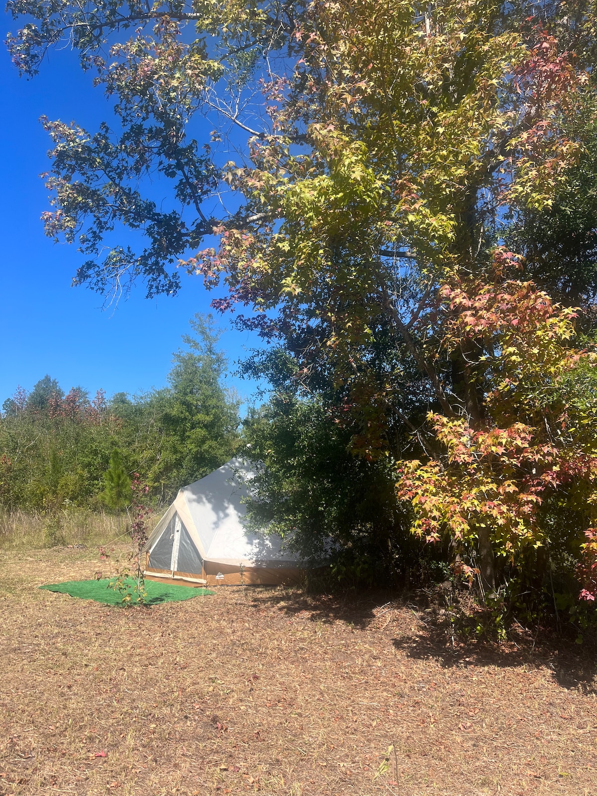 Unwind at Serenity Acres, your private glamping retreat, nestled amidst 10 acres of woods and fields. Enjoy Florida's cooler nights by the fire, and the warm sunny days. Our spacious 20' bell tent offers all the comforts of home, including a plush king-size bed, a cozy seating area, air conditioning, and heat. A full bathroom is located on the property for your personal use only, as tent guests. Shower under the moon with unlimited hot water! Relax at the fire, under the bright country stars!