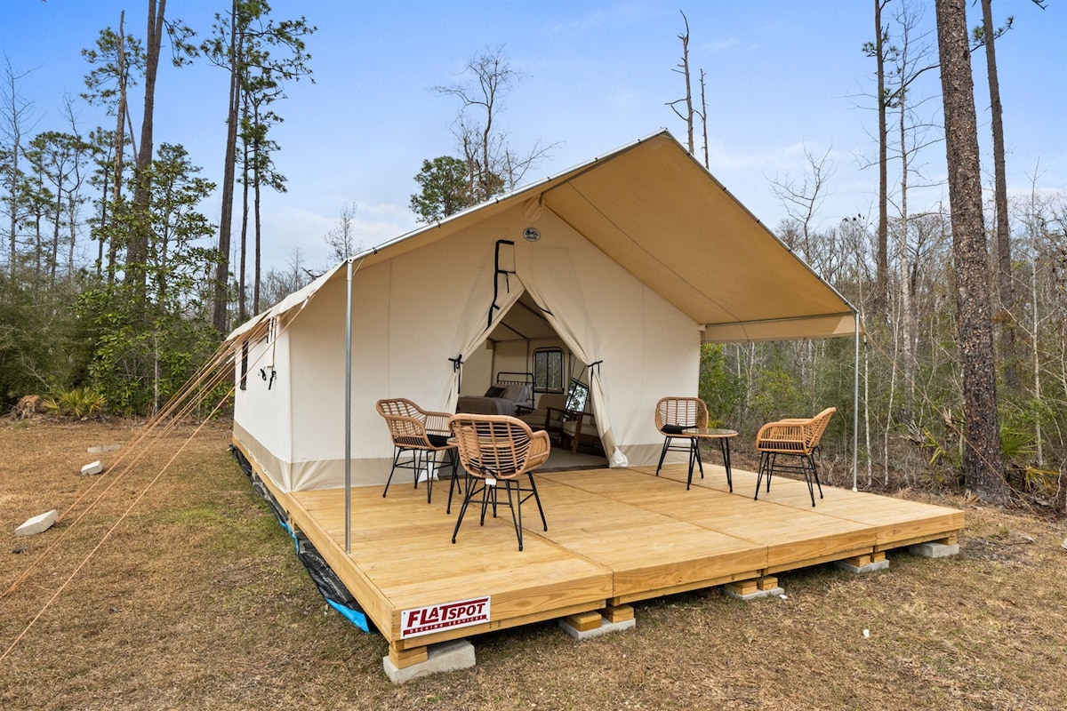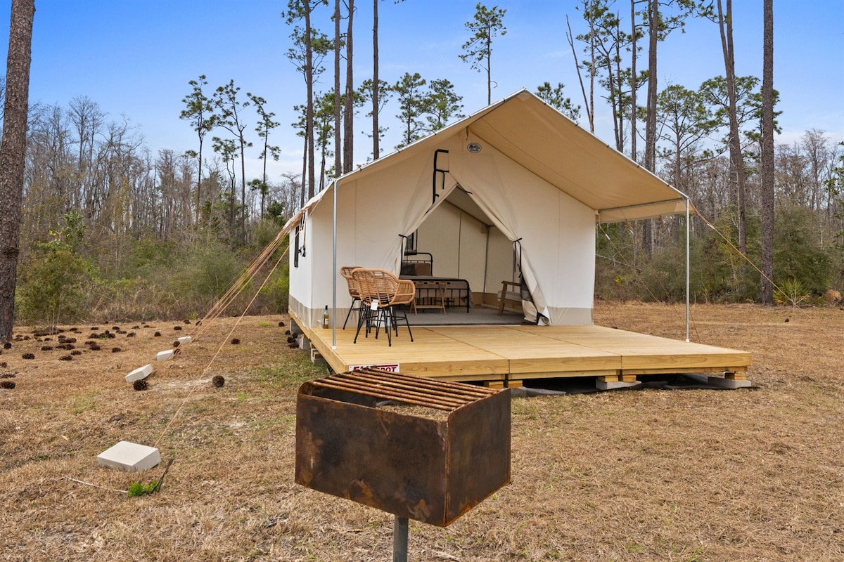 Unwind at Serenity Acres, your private glamping retreat, nestled amidst 10 acres of woods and fields. Enjoy Florida's cooler nights by the fire, and the warm sunny days. Our spacious 20' bell tent offers all the comforts of home, including a plush king-size bed, a cozy seating area, air conditioning, and heat. A full bathroom is located on the property for your personal use only, as tent guests. Shower under the moon with unlimited hot water! Relax at the fire, under the bright country stars!